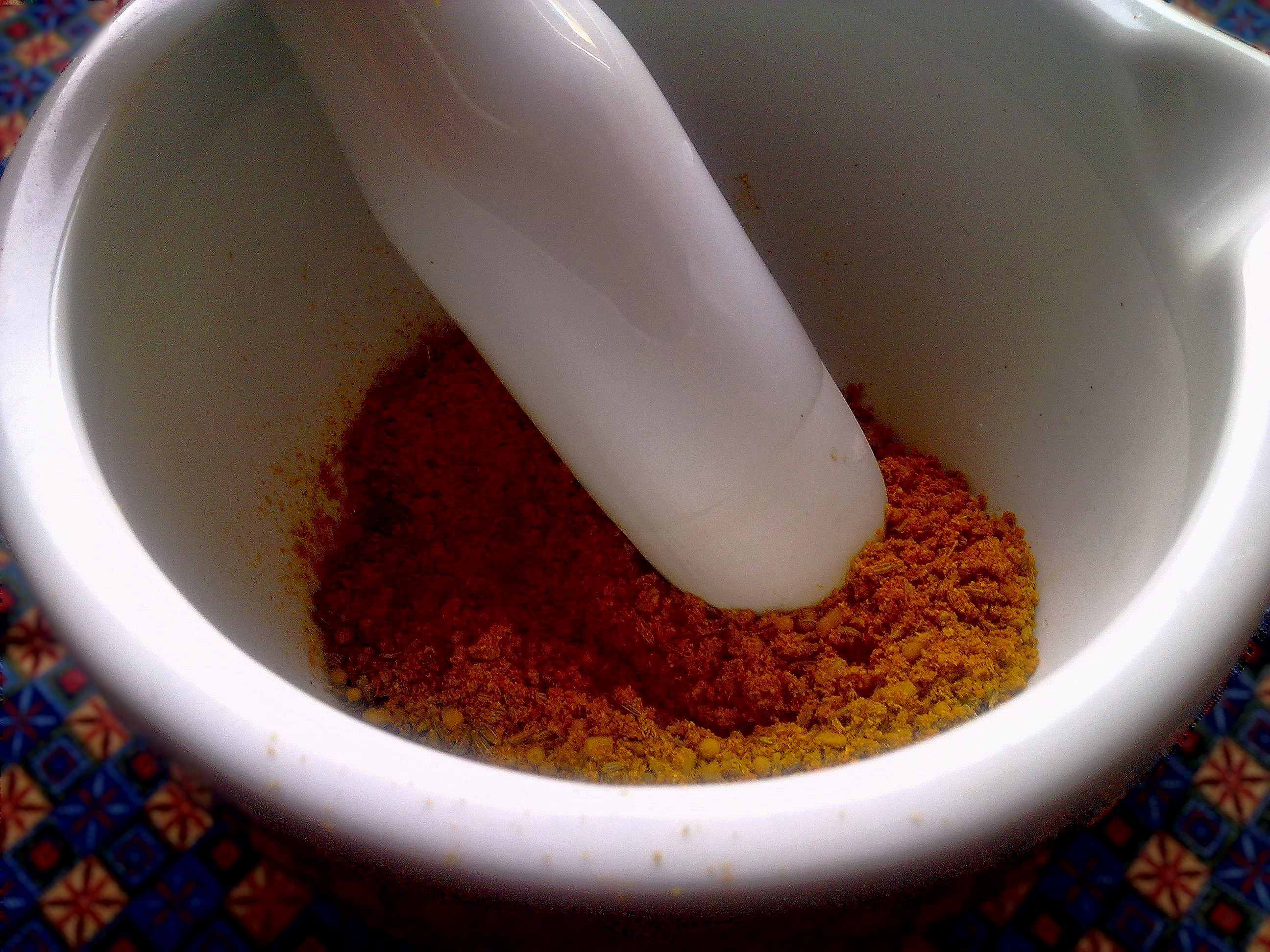 Wenn alles abgekühlt ist, die Gewürzmischung entweder im Mörser (für Geduldige) oder in einer sauberen Kaffeemühle (für Eilige) fein mahlen. In einem sauberen Behälter kühl und dunkel aufbewahrt, habt Ihr immer Euer eigenes Currypulver parat.