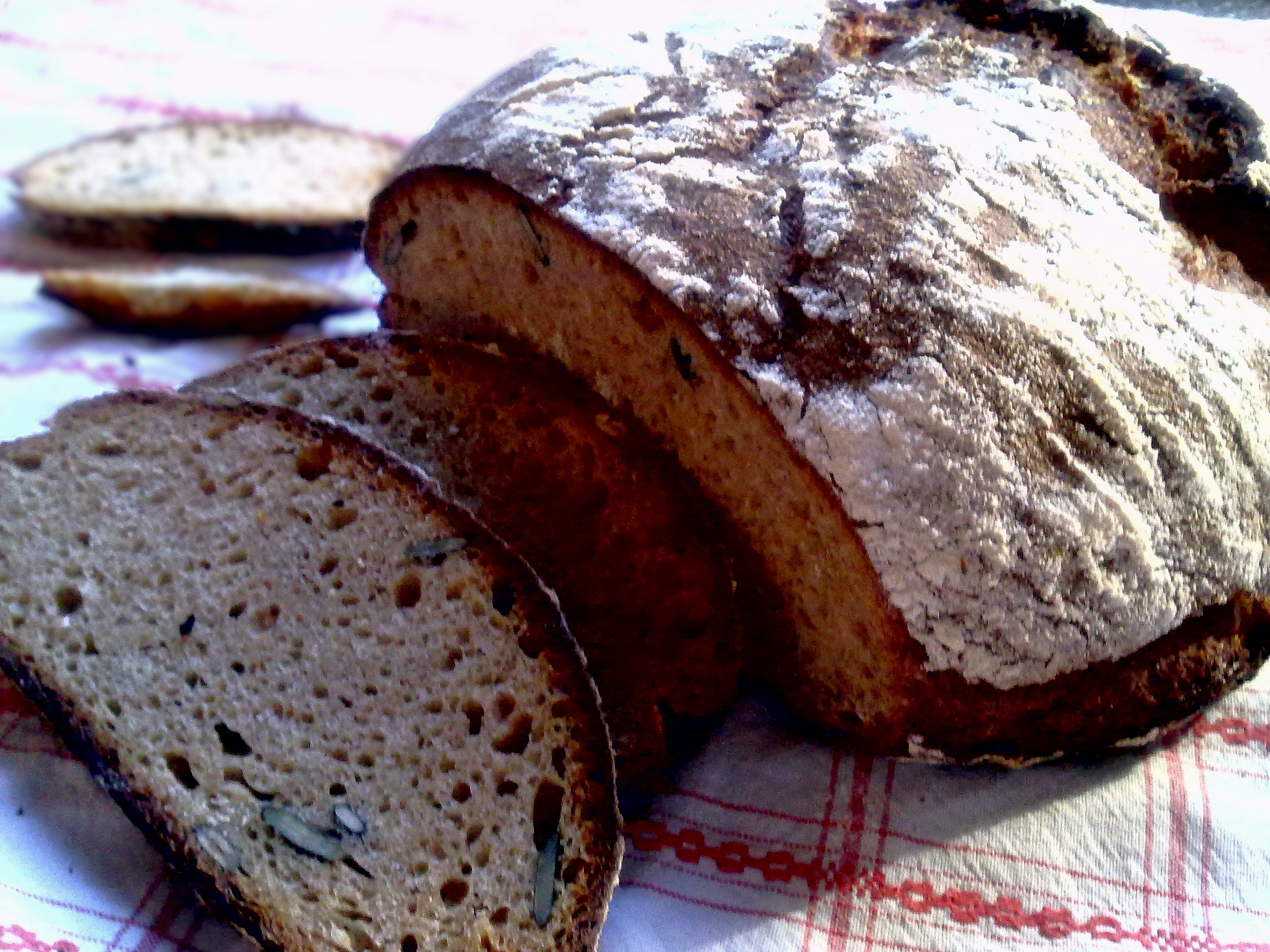 Die alljährliche Kürbisschwemme ist hier angekommen. Ich habe neulich endlich diese wunderbaren Ravioli gemacht und hatte noch eine gute Portion Kürbispürée übrig. Da kam mir Kürbisbrot in den Sinn. Das Brot ist eine Abwandlung des einfachen, schnellen und leckeren Standardrezeptes, nach dem ich regelmäßig unser tägliches Brot backe, wenn ich nicht grade was Neues ausprobieren möchte. Das Originalrezept ist von der Userin Elke-Carola aus dem Sauerteig-Forum; Ihr findet es hier. Für das Kürbisbrot habe ich einen Großteil der Flüssigkeit durch Kürbispürée ersetzt und ein paar Kürbiskerne an den Teig gegeben. Selbst die Kürbishasser in der Familie sind glücklich mit diesem Brot. Sollte mir also in dieser Saison nochmal Kürbis übrig bleiben, weiß ich, was ich zu tun habe. Andererseits kann man mit Kürbispürée auch diesen genialen Nudelteig machen. Wahrscheinlich muss ich jetzt doch noch sehr oft Kürbis kaufen…..