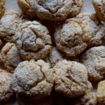 Alle Zutaten mischen und zu einer gleichmässigen Masse kneten. Vom Teig walnussgroße Häufchen abnehmen, zu Kugeln rollen, auf ein mit Backpapier belegtes Blech geben und etwas flach drücken. 20-30 min backen und auf einem Kuchengitter auskühlen lassen. Zum Servieren mit Puderzucker bestäuben.