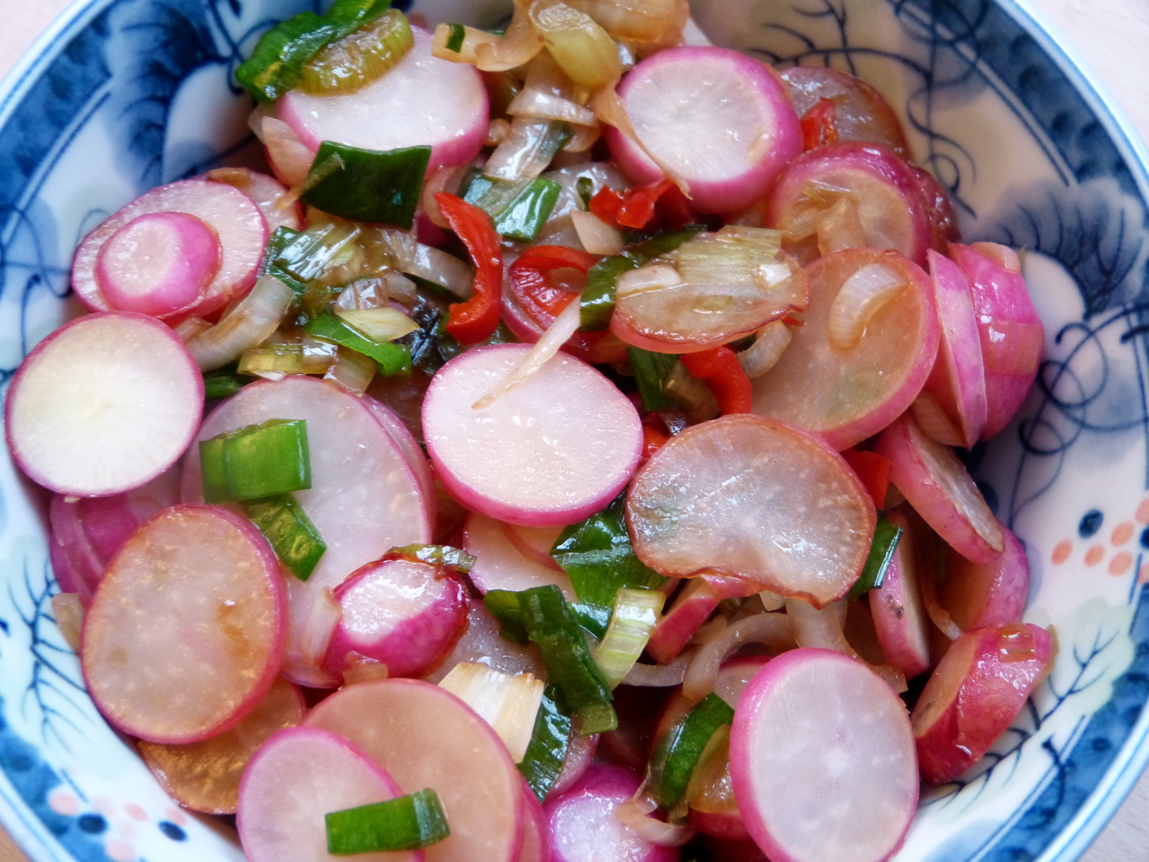 Einen Wok auf hoher Flamme erhitzen, dann das Öl hineingeben, Chili zugeben und kurz durchrühren. Dann Radieschen zugeben und alles einige Minuten pfannenrühren; dabei Sojasauce zugeben und, wenn nötig, salzen. Zuletzt Frühlingszwiebeln und Essig einrühren und alles unter Rühren nochmals heiß werden lassen.