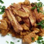 Kalbfleisch kommt hier kaum auf den Tisch. Für das Kalbsragout mit gelben Schälerbsen habe ich mal eine Ausnahme gemacht. Das sämige Ragout, das seine frische Note durch den großzügigen Einsatz von getrockneten Limetten bekommt, wird erstaunlicherweise mit einem Topping aus Pommes Frites serviert. Klingt seltsam, hat aber gut gepaßt.