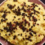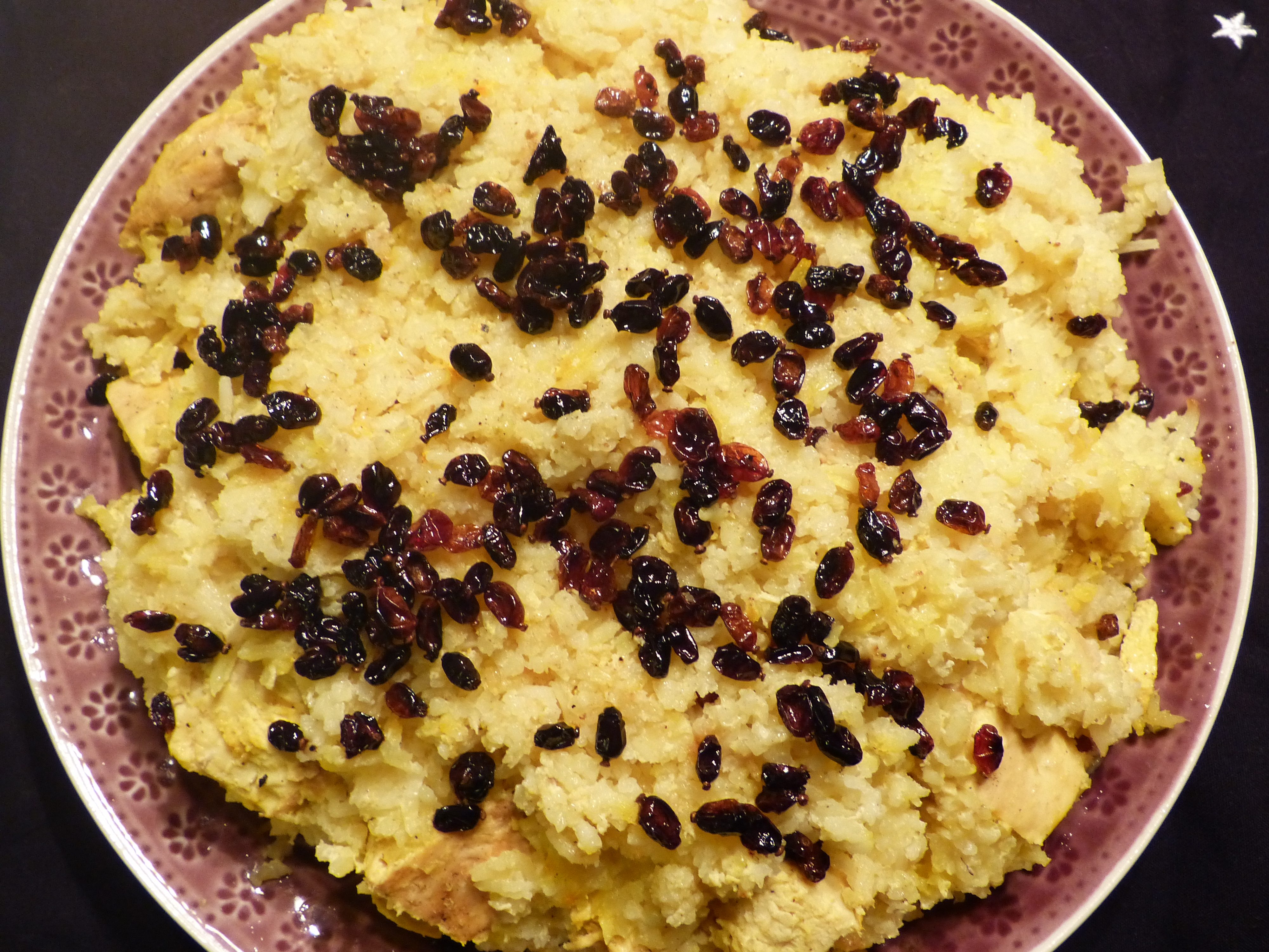 Vom Reiskuchen mit Safran und Hühnchen war ich ein wenig enttäuscht: Hühnchenbrust und angegarter Reis werden mit Eiern und einer Joghurt-Safran-Sauce im Ofen gegart. Mein Reis war ein wenig weich; ich hatte mir das Ergebnis etwas fluffiger vorgestellt.