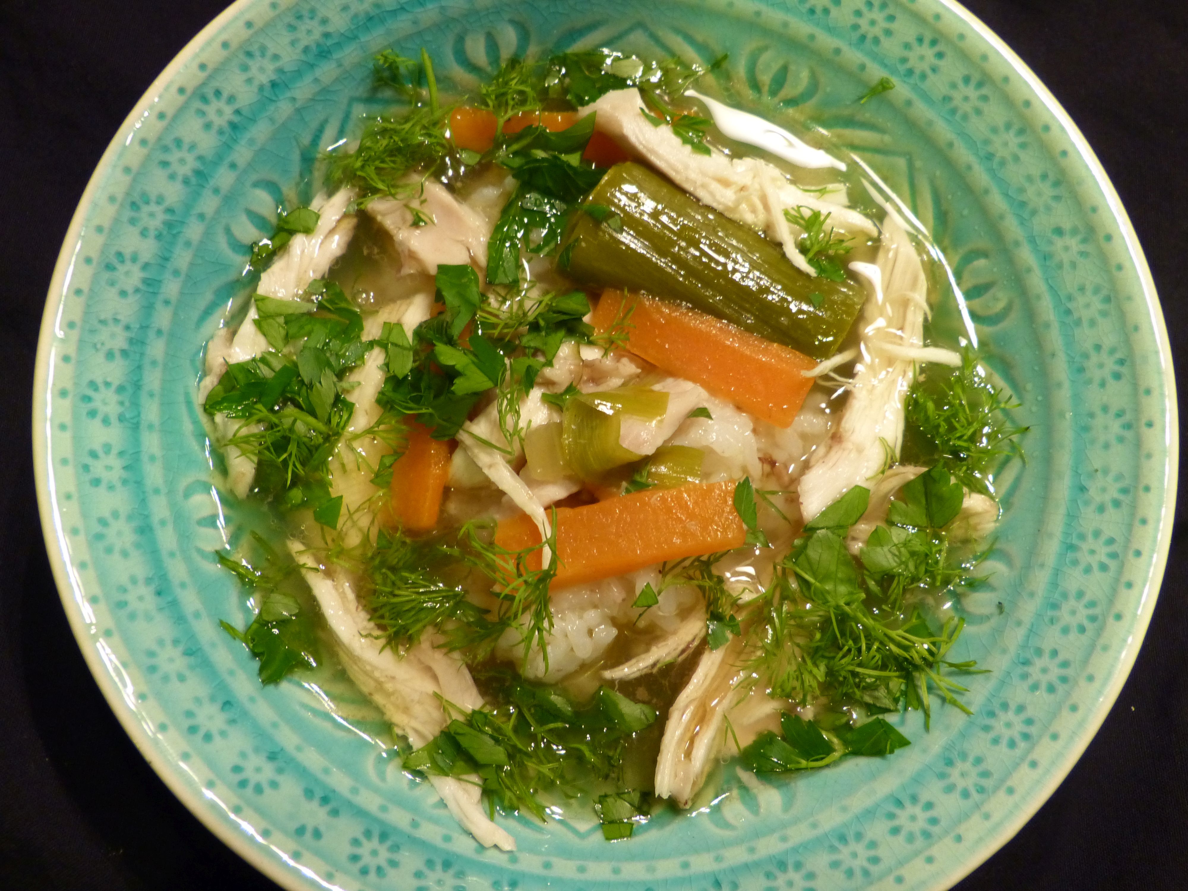 Das Huhn aus der Brühe nehmen und das Fleisch von den Knochen abziehen. Kräuter und Pfeffer ebenfalls entfernen. Das Fleisch wieder zur Suppe geben, nötigenfalls nachsalzen.