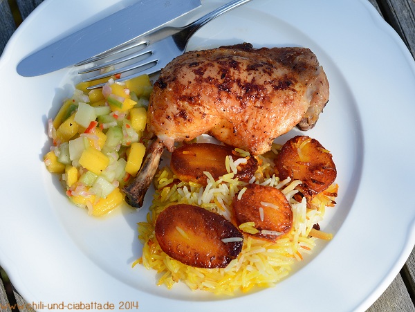 Auch in der zweiten Runde ist Petra wieder Erste 🙂 : Sie hat eine persisch inspirierte Reismischung mit Pistazie, Berberitze und getrockneter Bitterorangenschale geschenkt bekommen. Daraus macht sie einen wunderbaren Reis mit Kartoffelkruste und feurig scharfen Hähnchenkeulen. Mango-Gurkensalat gibt es auch noch dazu.