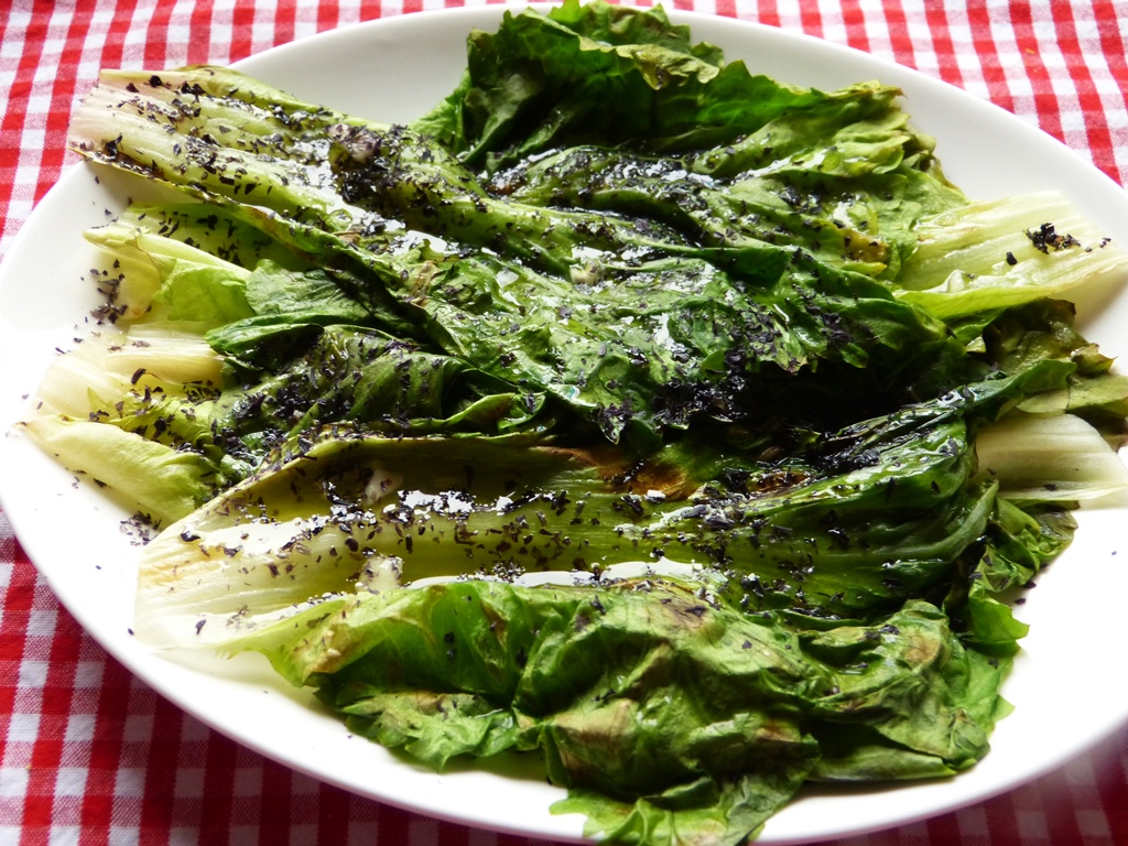 Endiviensalat war in der Gemüsekiste. Da musste ich gleich noch den gebratenen Endiviensalat probieren. Der ist schnell hergestellt – man läßt die tropfnassen Blätter in der heißen Pfanne rasch zusammenfallen, drapiert den Salat auf einer Platte und gibt dann ein Dressing aus Zitronensaft, Olivenöl und Knoblauch darüber. Der Clou sind die Algenflocken, die über das fertige Gericht gestreut werden – Klasse!