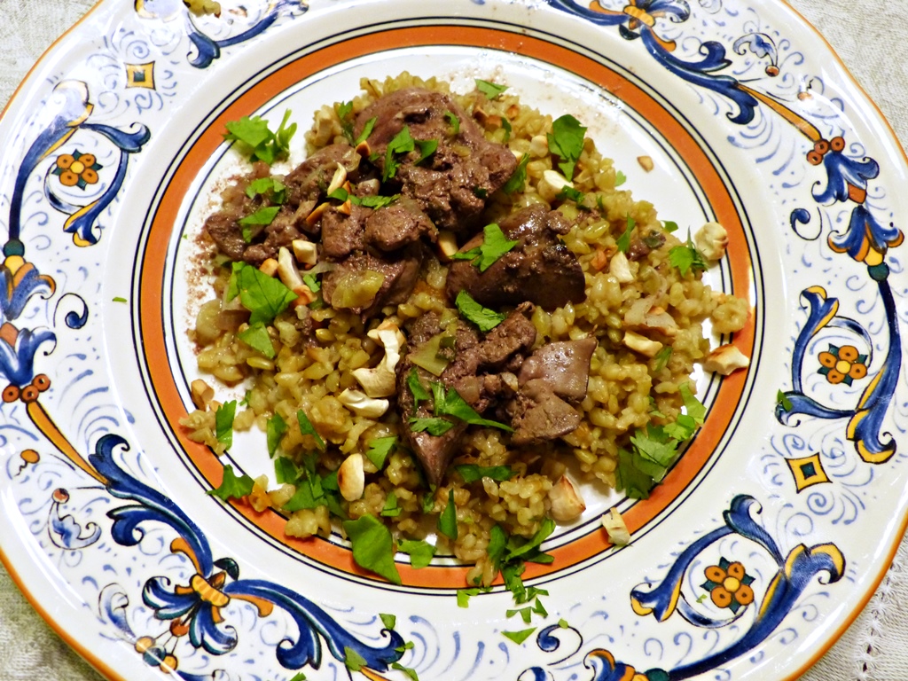 Ich hatte noch immer einen Rest Freekeh im Küchenschrank. Der wurde zu Freekeh mit Hühnchenleber. Der Freekeh wird mit Karotte und Piment verfeinert, was ihn schön aromatisch macht. Die Leber wird angebraten und in Brühe fertig gegart und ist schön cremig. Geröstete, gehackte Nüsse sorgen für etwas Biss. Einziger Wermutstropfen auch hier die Mengenangaben…500 gr. Freekeh hätten wir nicht geschafft, die Hälfte hat uns mehr als gereicht.