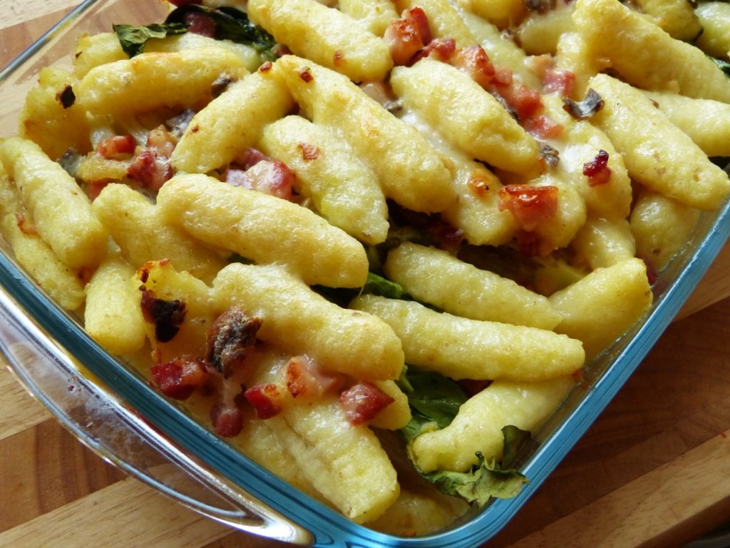 Die Gnocchi werden mit Knoblauch, Speck und Sardellen angebraten und kommen in eine Auflaufform, die vorher mit geviertelten Romana-Salatherzen ausgelegt wurde. Überbacken wird das Ganze mit einer Käsesauce. Das alles hat uns gut gefallen. Mich hat besonders der gebackene Romana-Salat begeistert, der gibt mit seiner Bitternote dem Gericht den letzten Kick.