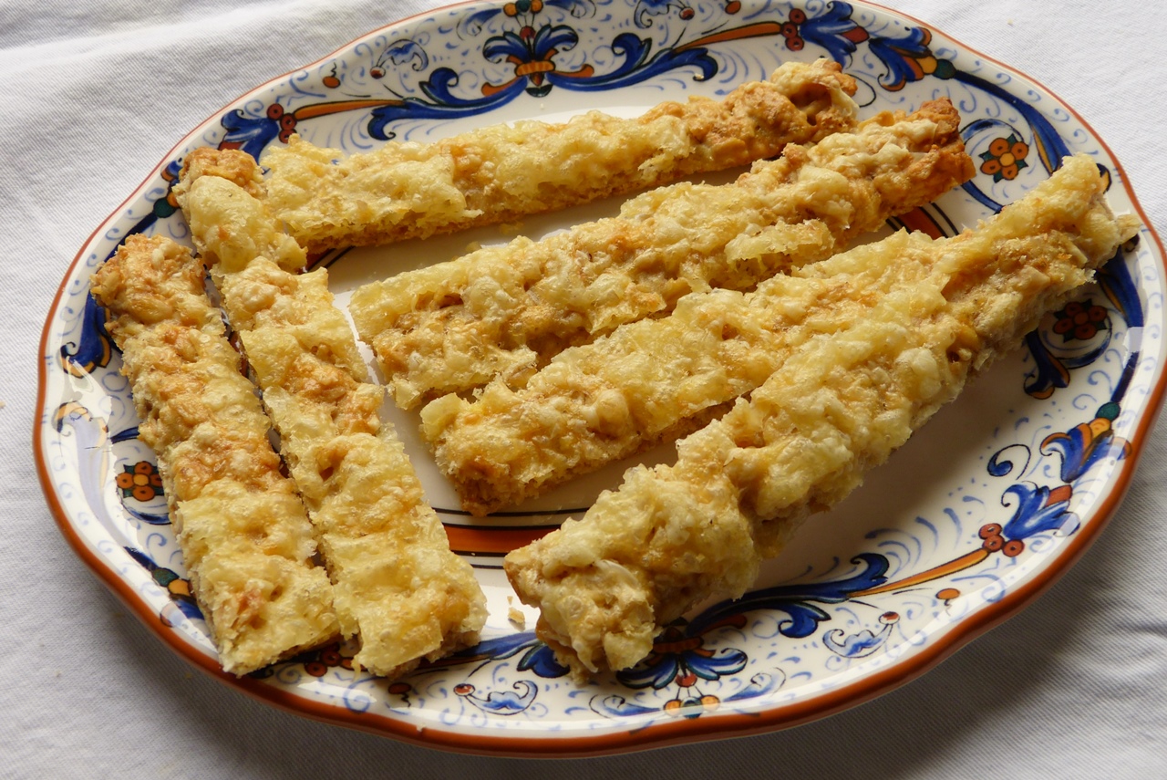 Mit den Haferflockenstangen, die mit Käse überbacken werden, hatte ich etwas Schwierigkeiten. Ich vermute mal, mit „Haferflocken“ im Rezept sind keine kernigen Flocken gemeint, sondern eher feine, denn mein Teig wollte nicht so recht zusammenhalten. Ich habe mir beholfen: Teig auf dem Blech ausgerollt, Stangen mit den Pizzaroller angeschnitten und erst nach dem Backen richtig in Stangen geteilt. Geschmeckt haben die Stangen wunderbar.