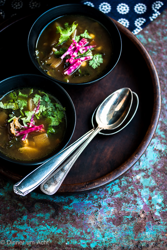 Claudia vermisst Schnee – zurecht. Aber wenigstens ist auf dem Gemüsemarkt Winter, und so wandern hübsche Ringelbete und Mangold ins Körbchen. Und im Küchenschrank warten die Kichererbsen, schon ziemlich lange wohl denn sie haben etwas länger gebraucht, um gar zu werden. Aber alles zusammen ergibt das alles eine herzerwärmende Bete-Koriandersuppe mit Mangold und Kichererbsen – da ist nicht mehr wichtig, dass das Wetter nicht mitspielt.