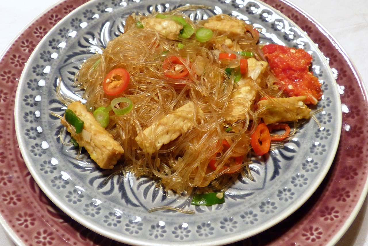 Glasnudeln und Tempeh – zwei typsische Produkte, die hier zusammen als Hauptgericht serviert werden. Außerdem mitspielen dürfen Frühlingszwiebeln, Knoblauch und Peperoni. Gekocht ganz spät nach einem nervigen Tag – ich habe weniger als 30 Minuten gebraucht. Dazu serviert habe ich einen Klacks selbstgemachtes Sambal Oelek.