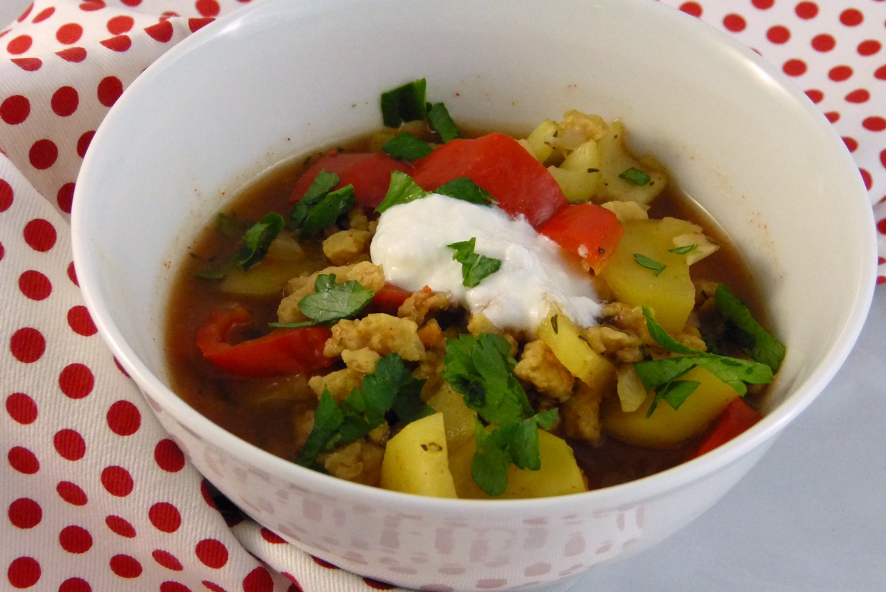 Und so gab es als erstes den Bauerntopf mit Kartoffeln und Hackfleisch. Und ja, ich habe gesündigt und bin vom Rezept abgewichen; sträflich eigentlich bei Rezensionen. Aber ich hatte halt noch Sojahack; das habe ich statt des geforderten Hackfleisches benutzt. Ergebnis? Der Eintopf war schön aromatisch, die Kartoffeln waren gar, die Paprika bissfest. Alles gut.