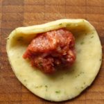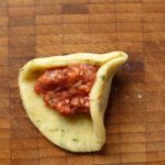 Eine Teigscheibe aus dem Kühlschrank nehmen und auf der leicht bemehlten Arbeitsfläche dünn ausrollen. Dicker als 4 mm sollte er nicht sein. Kreise von ca. 8 cm Durchmesser ausstechen. Zum Füllen je einen Teelöffel Füllung in die Mitte jedes Teigkreises geben. Dann rechts oben den Teig über die Füllung falten, anschließend von links. Anschließend das Dreieck von unten verschließen, dabei einfach die entstandenen Ecken mit den Fingern energisch zusammenkneifen.