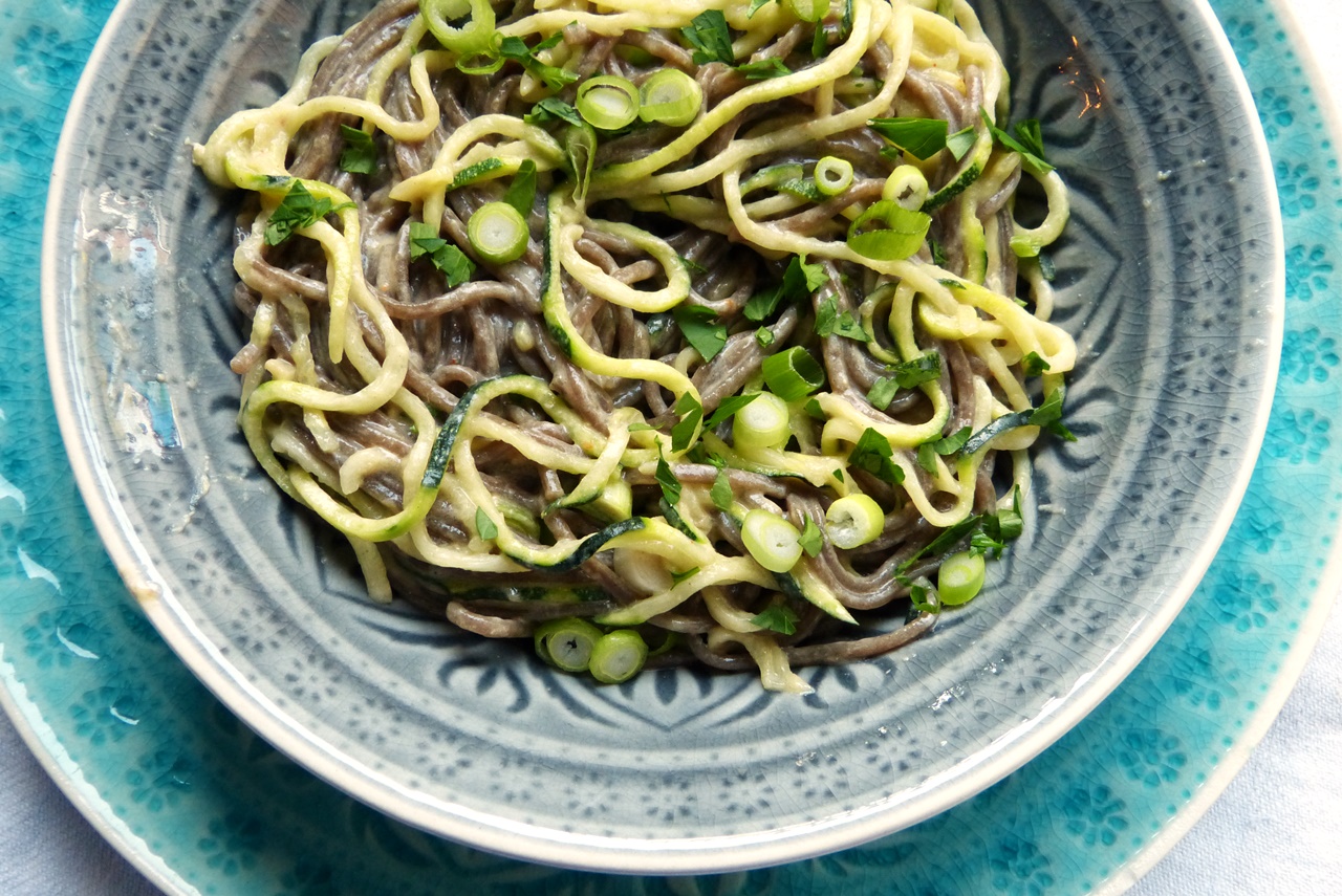 Soba-Nudeln aus Buchweizen sind aber auch nicht zu verachten. Wenn ich im Asia-Shop bin, nehme ich gerne eine Packung mit. Genauso gerne vergesse ich sie dann auch in der Vorratskammer. Um so erfreuter war ich, als ich im aktuellen Lieblingskochbuch* über Rezepte für Soba gestolpert bin. Wie es in dem Buch so üblich ist, gibt es ein Grundrezept und dann noch vier Varianten – je eine für Frühjahr, Sommer, Herbst und Winter. Das Grundrezept sind Soba mit Erdnusssauce (schreibt man das echt so?) und gemischtem Gemüse. Die sommerliche Variante ist mit Zucchini und Tahinsauce – was genau meine Kragenweite ist. Soba sind toll, Zucchini waren sowieso da und wenn dann noch Tahin mitspielen darf, dann kann das Ganze einfach nur gut sein. War es auch. Die Sauce ist genial. Die gab es hier nicht zum letzten Mal. Wer Tahin nicht so mag, nimmt Erdnussbutter oder ein anderes Nussmus.