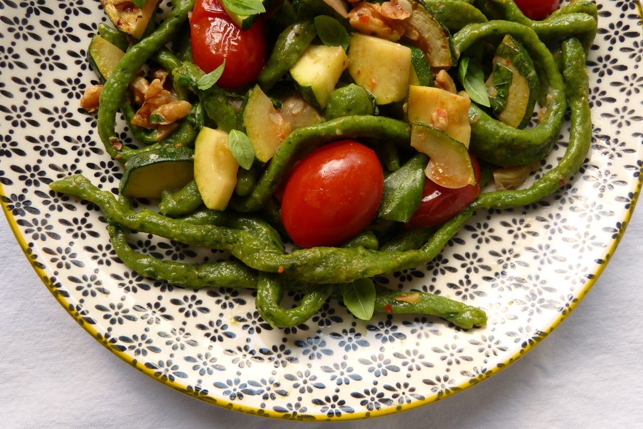 Sind die Nudeln erst mal gerollt, steht dieses Pastagericht aus „Genial gesund„* auch schon fast auf dem Tisch. Es müssen nur noch kurz Gemüse und Pasta gegart und alles in der Pfanne zusammengeführt werden.