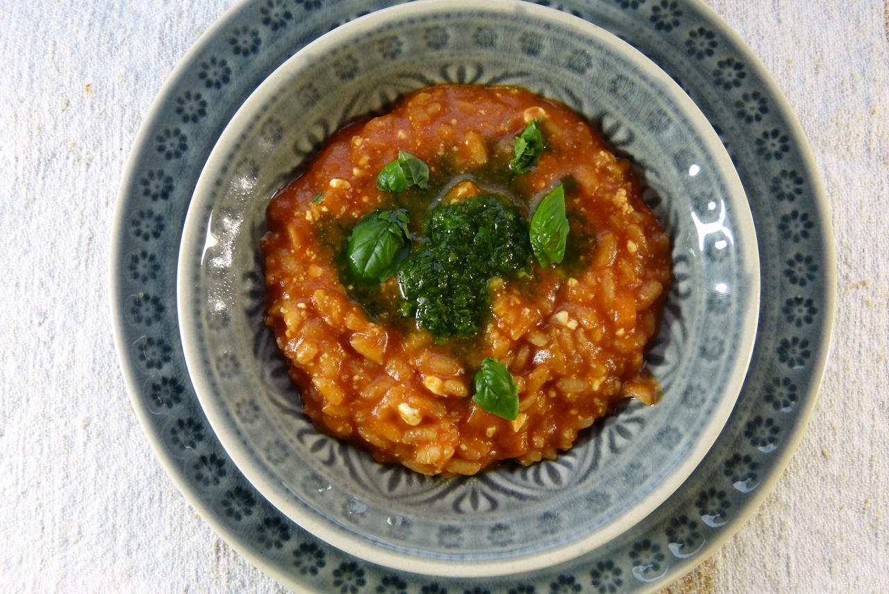 Da wäre zunächst mal das Topping mit Basilikum und Knoblauch. Tomate und Basilikum sind ja ein altes Ehepaar, und so ist es kein Wunder, dass sich die Sauce auf dem Risotto gut macht; das Aroma ist aber intensiver, als wenn man einfach Basilikum zugibt.