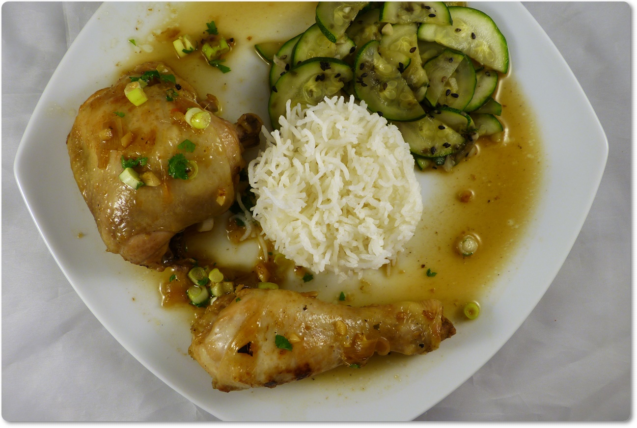 Zum Hühnchen passt einfacher gekochter Reis und ein wenig Gemüse aus dem Wok; bei uns waren es rasch gegarte Zucchini.