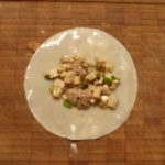 Jetzt geht es ans Zusammenbauen: dafür ein kleines Schälchen mit Wasser bereit stellen. Je einen Dumpling-Wrapper auf die Arbeitsfläche legen. 2 TL Füllung in die Mitte der Teighülle geben. Den Rand der Hülle mit Wasser befeuchten; das geht am besten mit dem Finger.