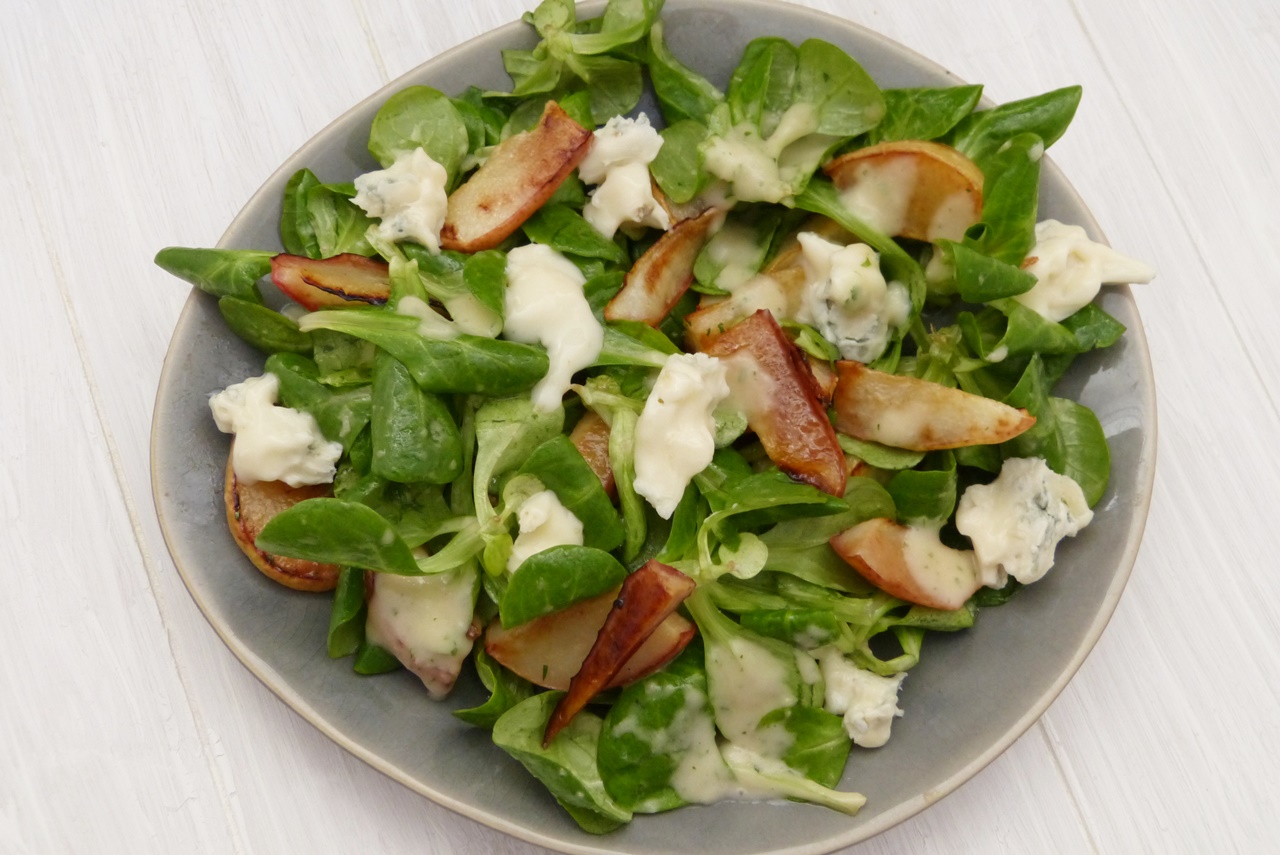 Für den Salat die Birnen vierteln und das Kerngehäuse entfernen. Die Viertel quer halbieren und die so entstandenen Stücke längs in mundgerechte Spalten schneiden. Etwas Öl in einer Pfanne erhitzen und die Birnenstücke braten, bis sie schön gebräunt und ein wenig weich sind. Abkühlen lassen.