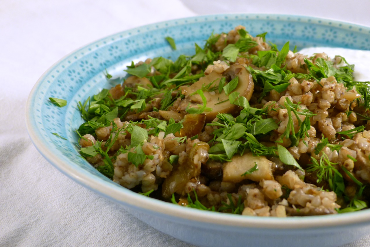 Diese Version hier, die ich in „Samarkand„* entdeckt habe, beschränkt sich nicht nur auf Zwiebeln – es kommen noch Pilze dazu. Der geröstete Buchweizen hat ein starkes Aroma, er schmeckt nussig und fast ein wenig bitter. Da sind die karamellisierten Zwiebeln und Pilze eine schöne Ergänzung.