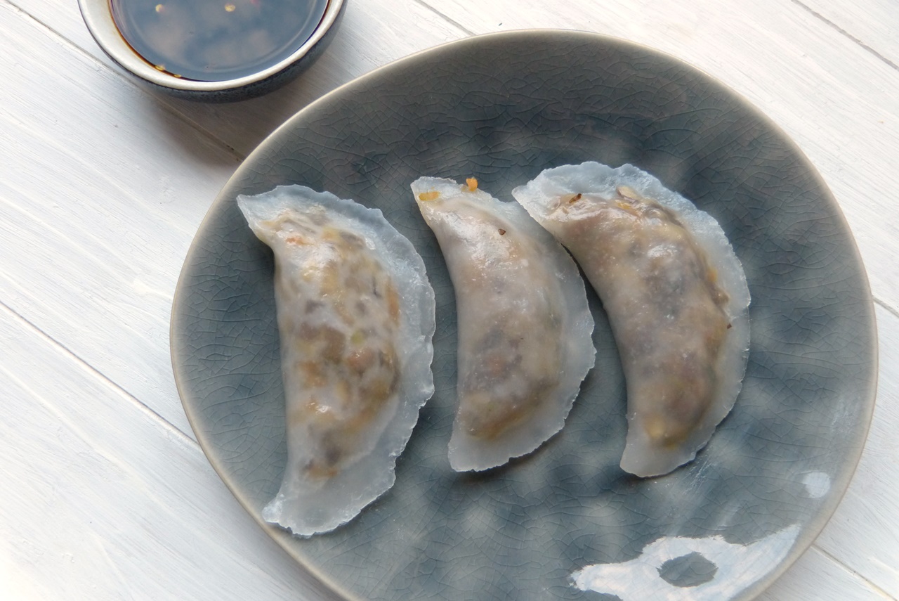 Gedämpfte Dumplings, da musste ich gleich an diese Teigtaschen denken, die beim Garen durchsichtig werden. Ich bin – wie üblich bei Andrea Nguyen fündig geworden. Der Teig für die Hüllen besteht aus Weizenstärke und Tapiokastärke. Das findet Ihr beides im Asia-Shop. Ein wenig Bammel hatte ich beim Lesen des Rezepts – aber es hat alles erstklassig funktioniert. Das gemischte Gemüse aus dem Original-Rezept habe ich durch Pilze ersetzt. Das Rezept ergibt 24 Dumplings – ein Snack für 6 bis 8 Leute oder eine Hauptmahlzeit für 3 bis 4.