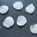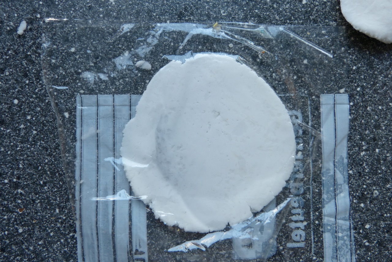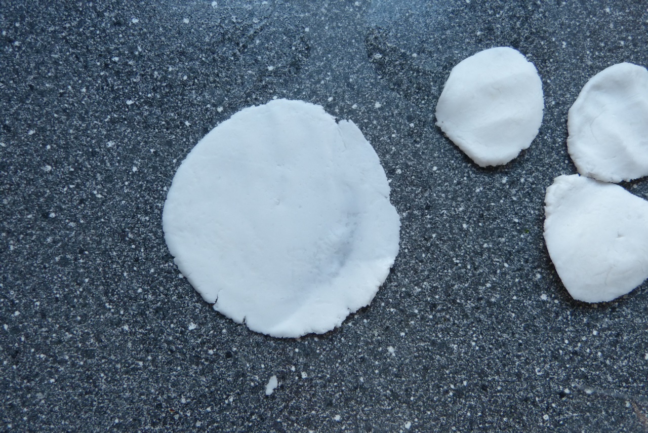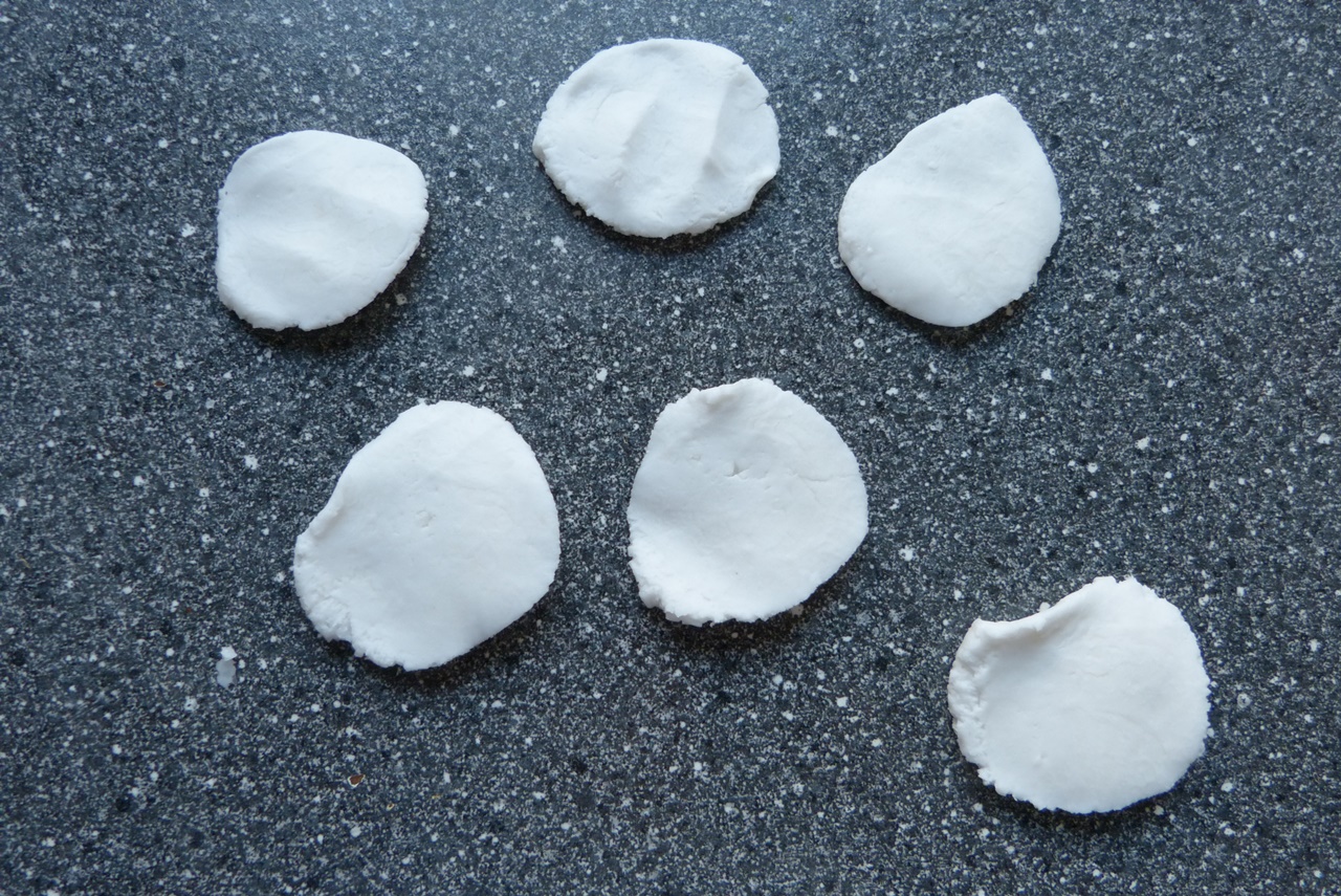 Ein Stück Teig nehmen und auf der unbemehlten Arbeitsfläche zu einem länglichen Klotz formen. Den Klotz in 6 Teile schneiden. Jedes Teil zwischen den Handflächen zu einem flachen Kreis pressen. Je einen Kreis auf die geölte Seite des Frischhaltebeutels geben, den zweiten Beutel mit der geölten Seite auf den Teigkreis legen. Ein Wasserglas mit flachem Boden auf den Teigkreis stellen und kräftig pressen, bis man einen runden Teigfladen von ca. 2 mm Dicke hat. Das Plastik abziehen.