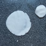 Jetzt zu den Teighüllen. Dafür die beiden Sorten Mehl zusammen mit dem Salz in eine Schüssel geben. Eine Mulde in die Mitte machen und 14 Esslöffel von dem Wasser hineingeben. Mit einem Löffel oder – besser – mit einem Silikon -Teigschaber alles zu einem Teig verarbeiten. Dabei langsam und vorsichtig vorgehen, die Stärke staubt ziemlich. Teig sieht erst transparent aus, danach wird er weiß und klumpig. Wenn alles Wasser eingearbeitet ist, das Öl zugeben. Weiter mit dem Spatel arbeiten. Wenn der Teig zu trocken wirkt, noch etwas Wasser zugeben. Der Teig soll eher fest sein, er erinnert an Knetmasse. Nicht die harten Stangen Schulknete, sondern eher Playdough. Die Zutaten zu einem Ball pressen, auf die Arbeitsfläche und den warmen Teig noch ein bis zwei Minuten kneten. Der Teig soll nicht brüchig sein, wenn man ihn presst. Wenn er bröckelig ist, etwas Öl auf eine Handfläche geben und durch Kneten in den Teig einarbeiten. Fertigen Teig in 4 Teile teilen, in einen Gefrierbeutel geben, luftdicht verschließen und 5 min ruhen lassen.