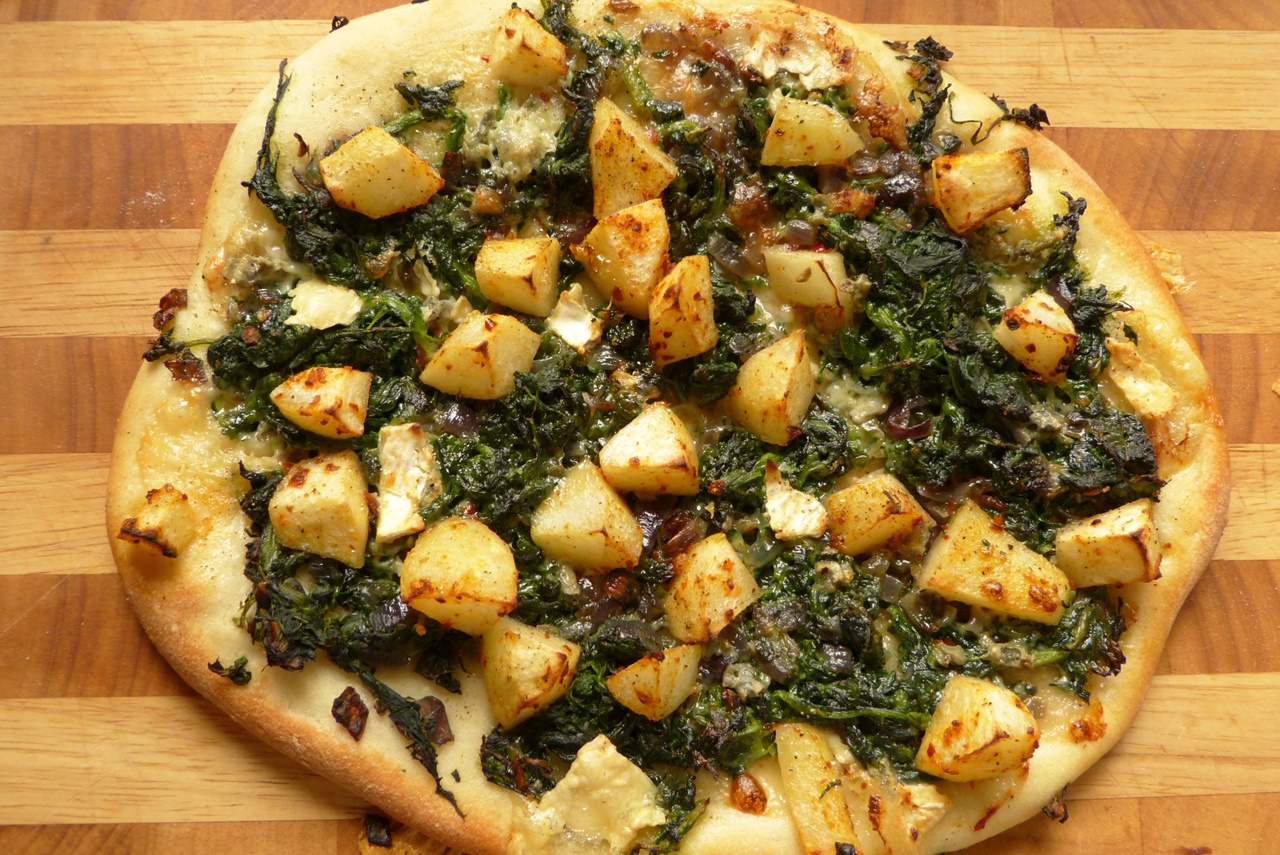Den Teig auf die leicht bemehlte Arbeitsfläche geben, in 3 bis 4 Portionen teilen und einige Minuten ruhen lassen. Dann jeweils eine Portion auf einem leicht bemehlten Pizzaschieber so dünn wie möglich ausrollen. Einen Teil der Spinatmischung auf dem Boden verteilen, mit Birnenstücken belegen und den Käse darüber krümeln. Etwas Olivenöl und Pfeffer darauf geben. Im heißen Ofen ca. 10 bis 12 Minuten backen, bis sich Blasen bilden, dann sofort servieren. Mit restlichem Teig und Belag genauso verfahren.