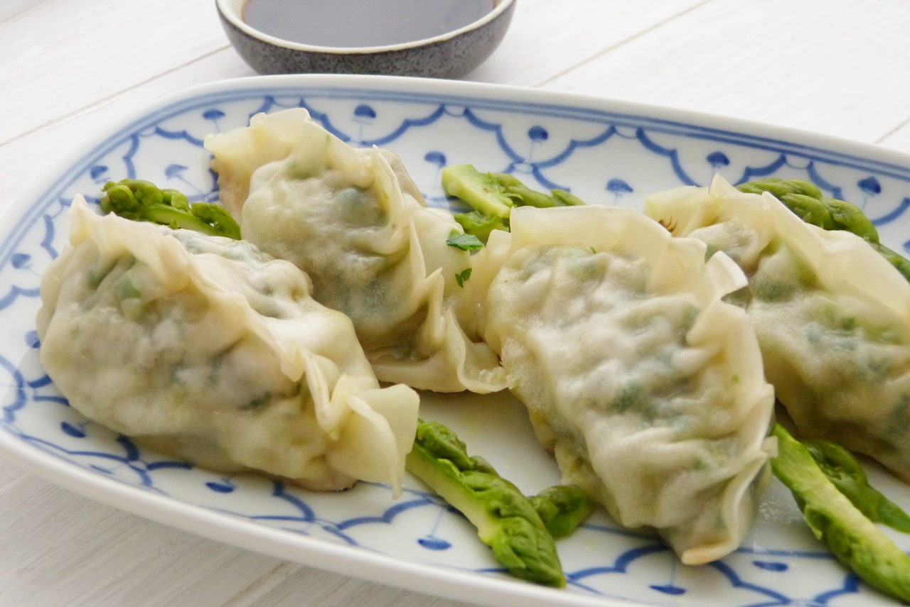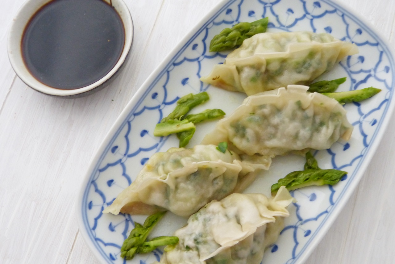 Es ist angespargelt – endlich! Spargel ist tatsächlich das, worauf ich mich im Frühjahr am meisten freue. Einmal muss es ihn klassisch mit Hollandaise geben, die restliche Zeit bleibt fröhlichen Experimenten überlassen. So kann der Spargel auch in Potstickers wandern.