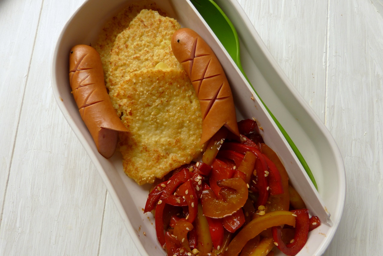 Meinen ersten Versuch habe ich aus unterschiedlichen Kapiteln zusammengewürfelt: es gab Hirse-Kartoffelpfannkuchen aus dem nicht so japanischen Teil, weil die Hirse endlich weg musste. Dazu Paprika-Kinpiria, das sind rasch gebratene und mit Sojasauce und Chiliflocken gewürzte Paprika. Und schließlich habe ich mir noch die Würstchen-Fische aus einem Salat geschnappt.