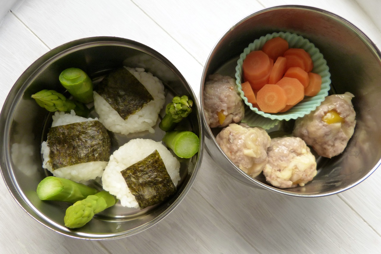 Dann wurde es klassisch: Bento mit einfachen Onigiri, also Reisbällchen, Fleischbällchen in süßsaurer Sauce, in Orangensaft gegarte Karotten und Spargel. Die Fleischbällchen werden in der Mikrowelle gegart, ersatzweise gedämpft. Ich habe mich überwunden und das Garen in der Mikrowelle ausprobiert – es hat einwandfrei funktioniert. Einzig auf den Spargel hätte ich verzichten können: der wird lediglich gedämpft, und so ganz ohne jegliche Würze bringt das zwar Farbe ans Bento, schmeckt aber langweilig. Im Rezept werden außerdem nur die Spitzen verwendet – dafür bin ich nicht zu haben.