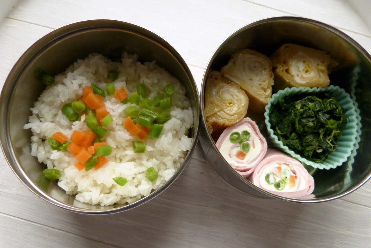 Tamagoyaki-Bento: Tamagoyaki heißt gebratenes Ei; es ist ein gerolltes Omelett. Ich esse das sehr gerne. Im Buch gibt es gute Tipps, wie das Omelette auch ohne die normalerweise verwendete rechteckige Pfanne gelingt. Zum Omelette gibt es hübsche gefüllte Schinkenröllchen, etwas mit Knoblauch und Chili gebratenen Spinat und natürlich Reis.