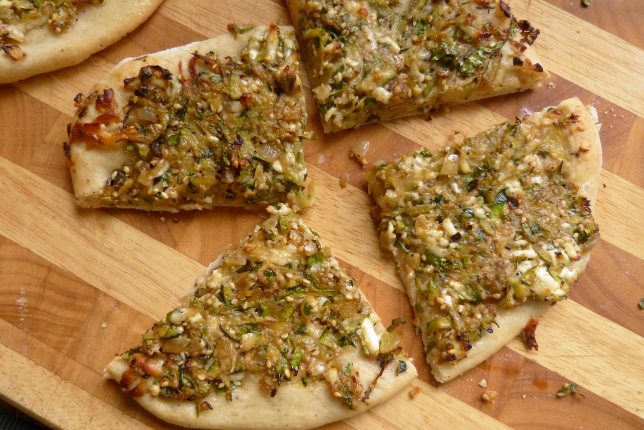 Hier besteht der Belag aus geriebener Zucchini (man kann auch gut eine dieser Monster-Keulen verwenden), zwei Sorten Käse und Nüssen – das ist klasse und wird wiederholt werden.