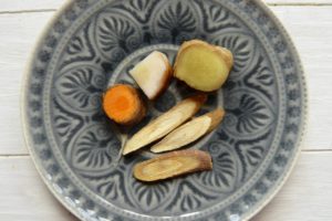 Als erstes das Goldene Ingwer-Trio: Ingwertee gehört zu meinen Standards – den trinke ich wirklich oft; und zwar unabhängig davon, ob er etwas auskurieren soll oder nicht. Hier kommt der Ingwer in Begleitung von Kurkuma (links oben), Galgant (oben Mitte) und Süßholz (unten auf dem Tellerchen) daher. Ingwer wärmt, regt die Verdauung und den Kreislauf an. Galgant hat ähnliche Eigenschaften und tut zudem noch der Lunge gut. Kurkumawurzel ist ja zur Zeit sowieso in aller Munde – sie schmeckt leicht bitter und erdig und bringt Immunystem und Stoffwechsel auf Trab. Süßholz kennen die meisten aus Lakritz. Die Wurzel stärkt Nervensystem, Verdauung, Nebennieren und Lungen. Und sie sorgt dafür, dass der Tee aromatisch ausgeglichen schmeckt. Ich trinke den Tee jetzt regelmäßig – ich mag ihn einfach.