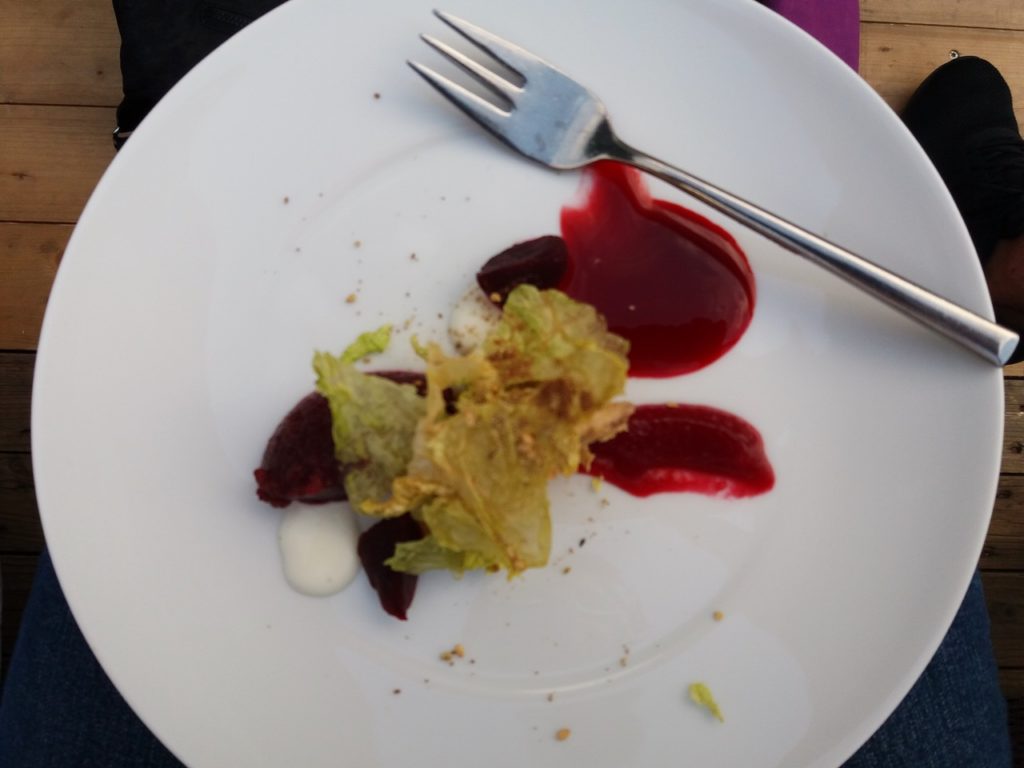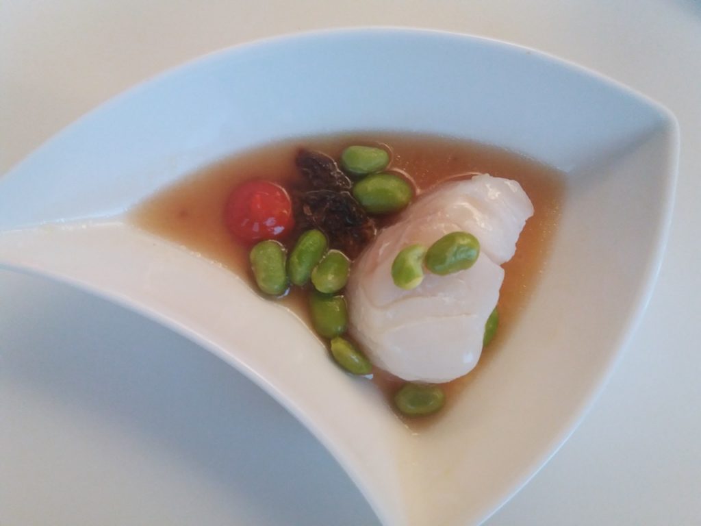 Wir hatten einen gelierten Borschtsch als Vorspeise mit einem Topping aus Wirsingchips. Ein Tipp von Heiko für alle die Wirsing-Chips machen wollen: den Kohl vor dem Dörren blanchieren, dann geht das übermäßig Kohlige weg. Es gab Schellfisch in einem malayisch inspirierten Sud auf Basis von Schweinefleisch, dazu Edamame und Pork Floss. Pork Floss ist getrocknetes, in Fasern zerzupftes Schweinefleisch. Ihr bekommt es im Asiashop. Ebenfalls beeindruckend: das Sous Vide gegarte Schweinefleisch – zart, noch rosa und doch gar.