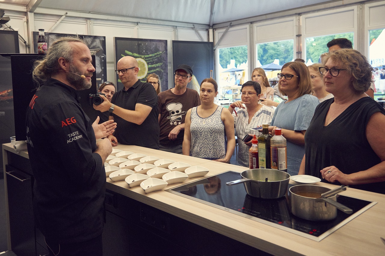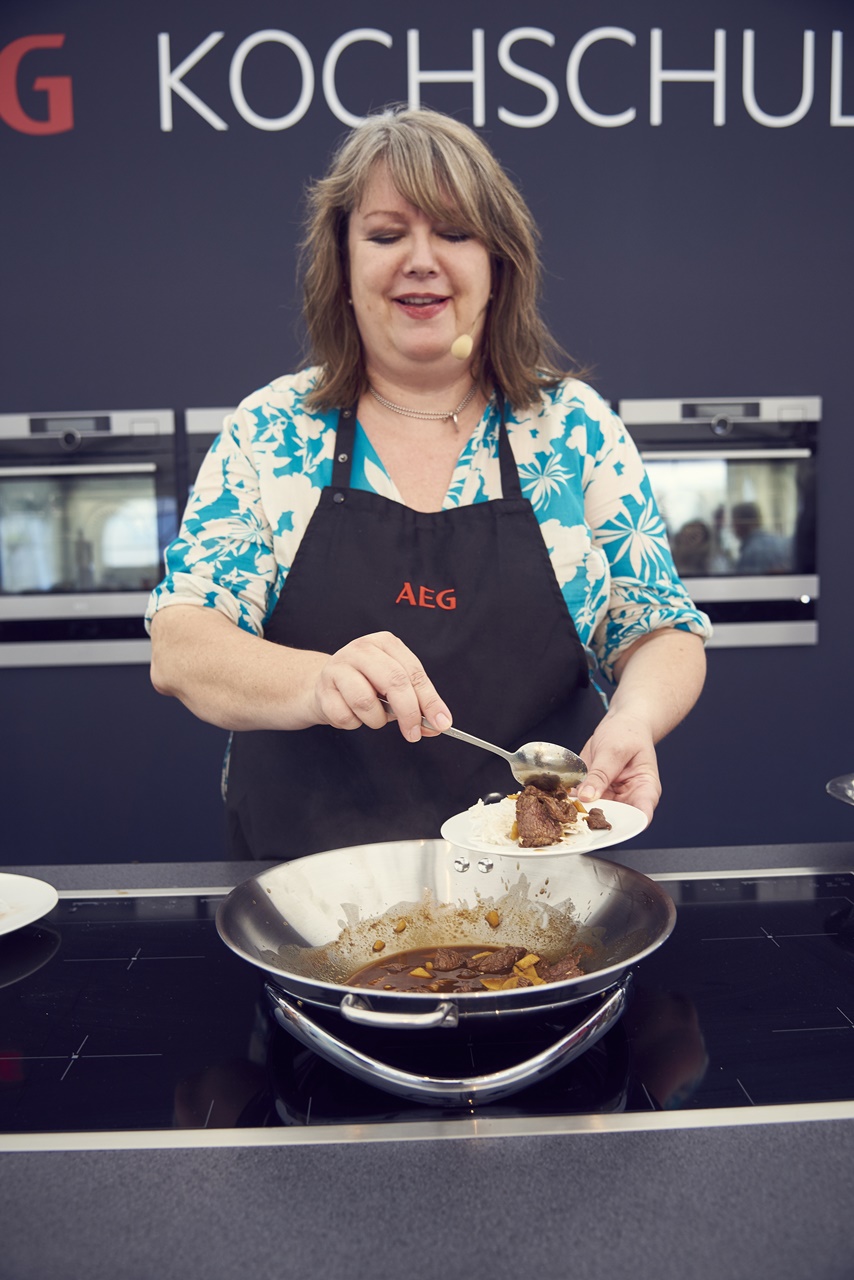AEG war mit einigen Features vertreten, unter anderem der Kochschule und der Taste Academy. Ich war am Freitag Abend da und wanderte erst einmal in die Kochschule, um zusammen mit Claudia Okinawa Ginger Beef zuzubereiten.