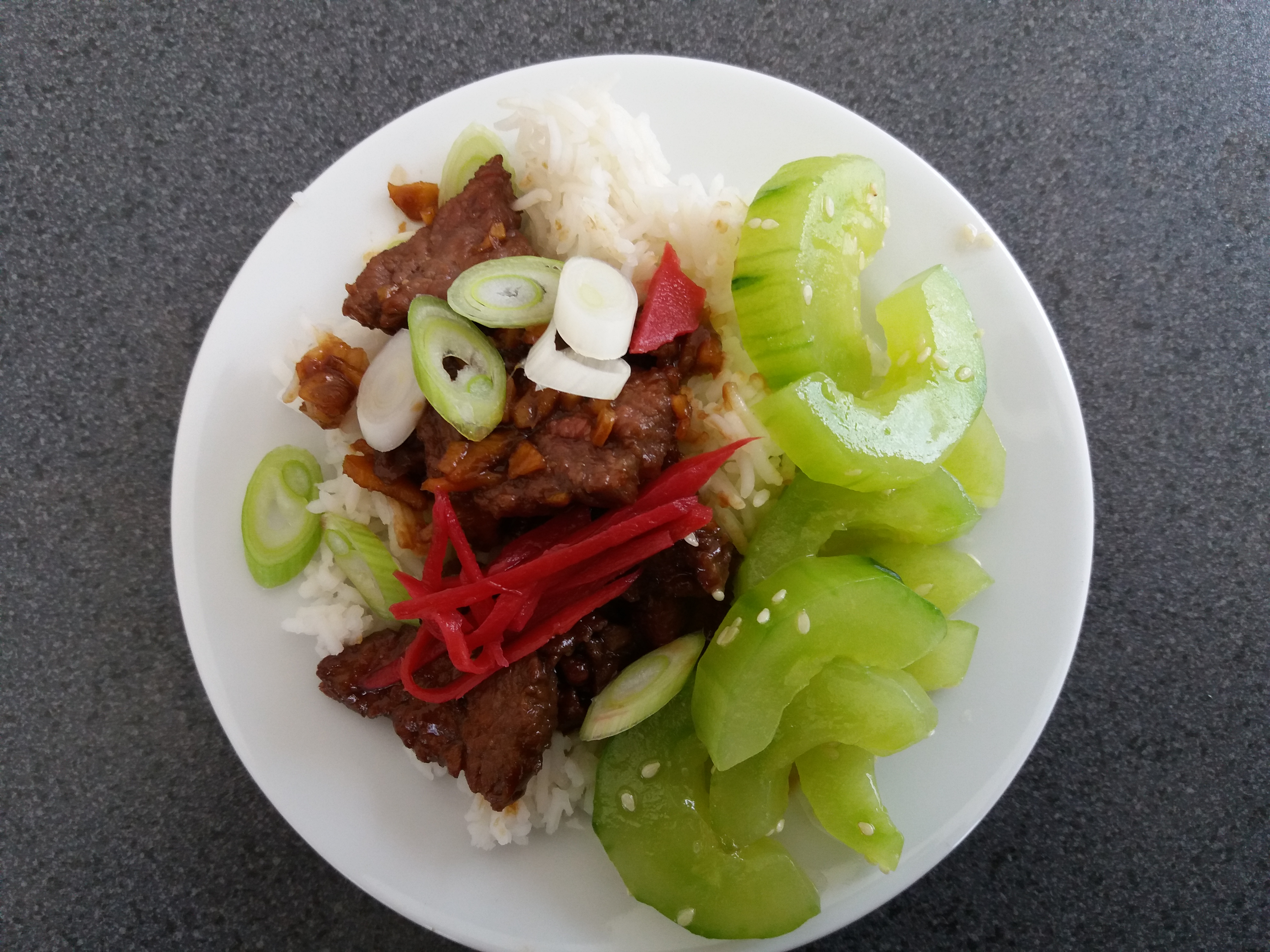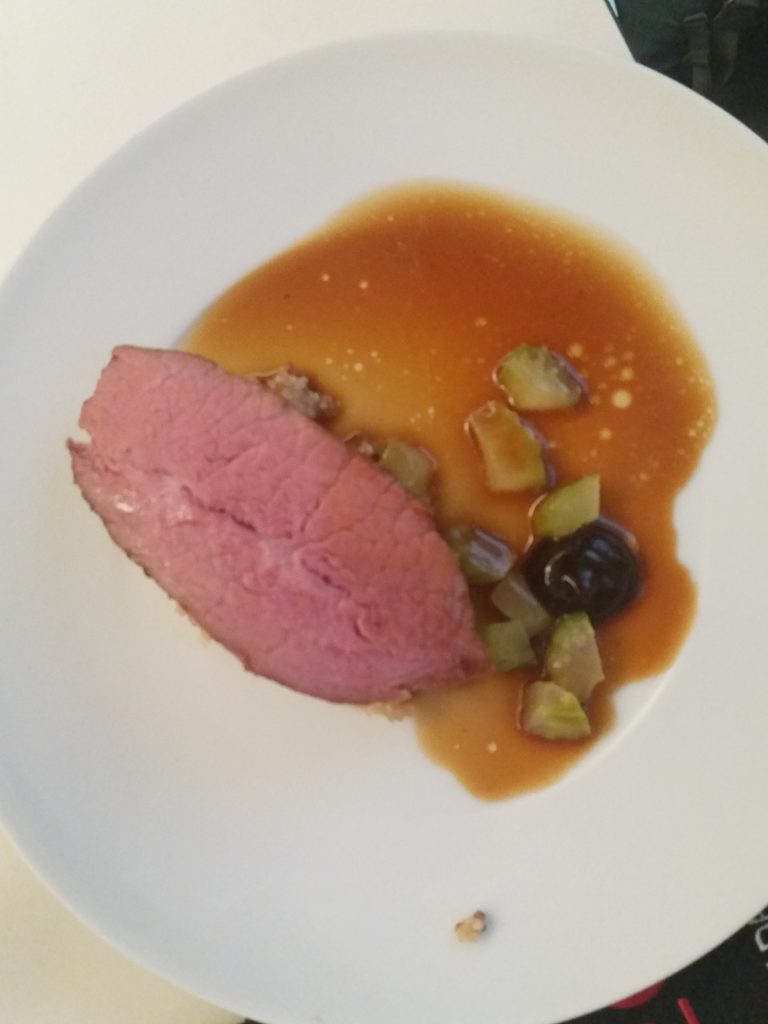 Für das Gericht wird mit Ingwer, Knoblauch, Sake, Mirin, Sojasauce und gebratenes Rinderfilet zusammen mit im Vakuum marinierter Gurke und eingelegtem rotem Ingwer serviert. Wer das Rezept haben möchte: hier ist es nachzulesen.