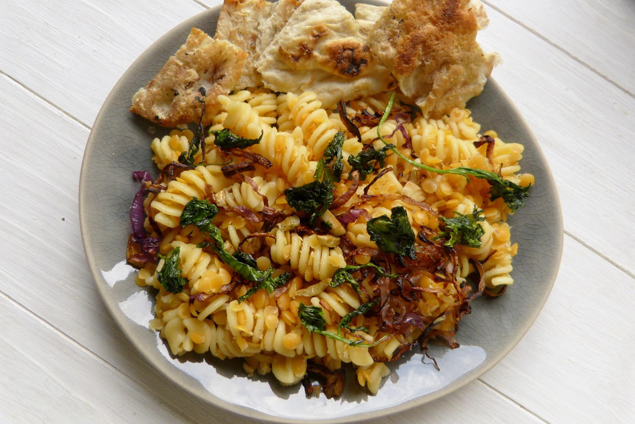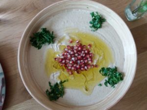 Nudeln mit Linsen – manchmal denke ich, von diesem Gericht hat jedes Land seine eigene Version. Es gibt Linsen mit Spätzle, es gibt Pasta e Lenticce, es gibt Koshari und es gibt in Syrien Harrah Esbao. Wobei, laut Malakeh ist das eine abgekürzte Version, im Original werden keine Nudeln verwendet, sondern ein komplizierter Teig. Wie auch immer – Pasta und Linsen, abgeschmeckt mit Zitronensaft und Granatapfelsirup und ein Topping aus Röstzwiebeln und gebratenem Koriander. Und geröstetes Brot, damit die Kohlehydrate nicht zu kurz kommen ;-). Uns hat das gut geschmeckt. Obwohl ich die Granatapfelkerne vergessen habe, die ein weiteres Topping bilden.