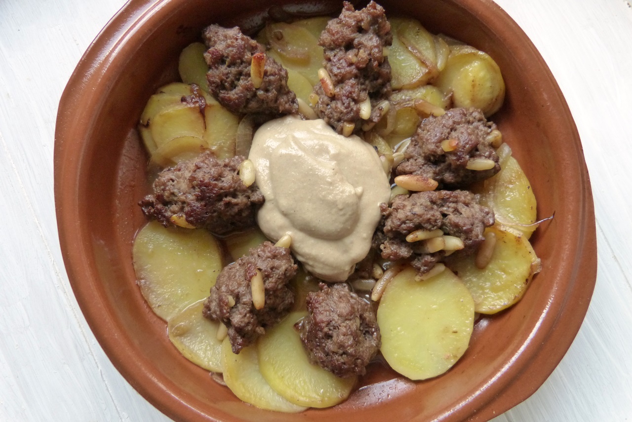 Wenn das Wort „Tahin“ in einem Rezeptitel vorkommt, werde ich hellhörig; so auch beim Kebap Tahini. Das sind Hackfleischnocken mit Pinienkernen, serviert auf Kartoffeln mit einer Sauce aus Tahin, Zitrone und Joghurt. Einfach und gut.