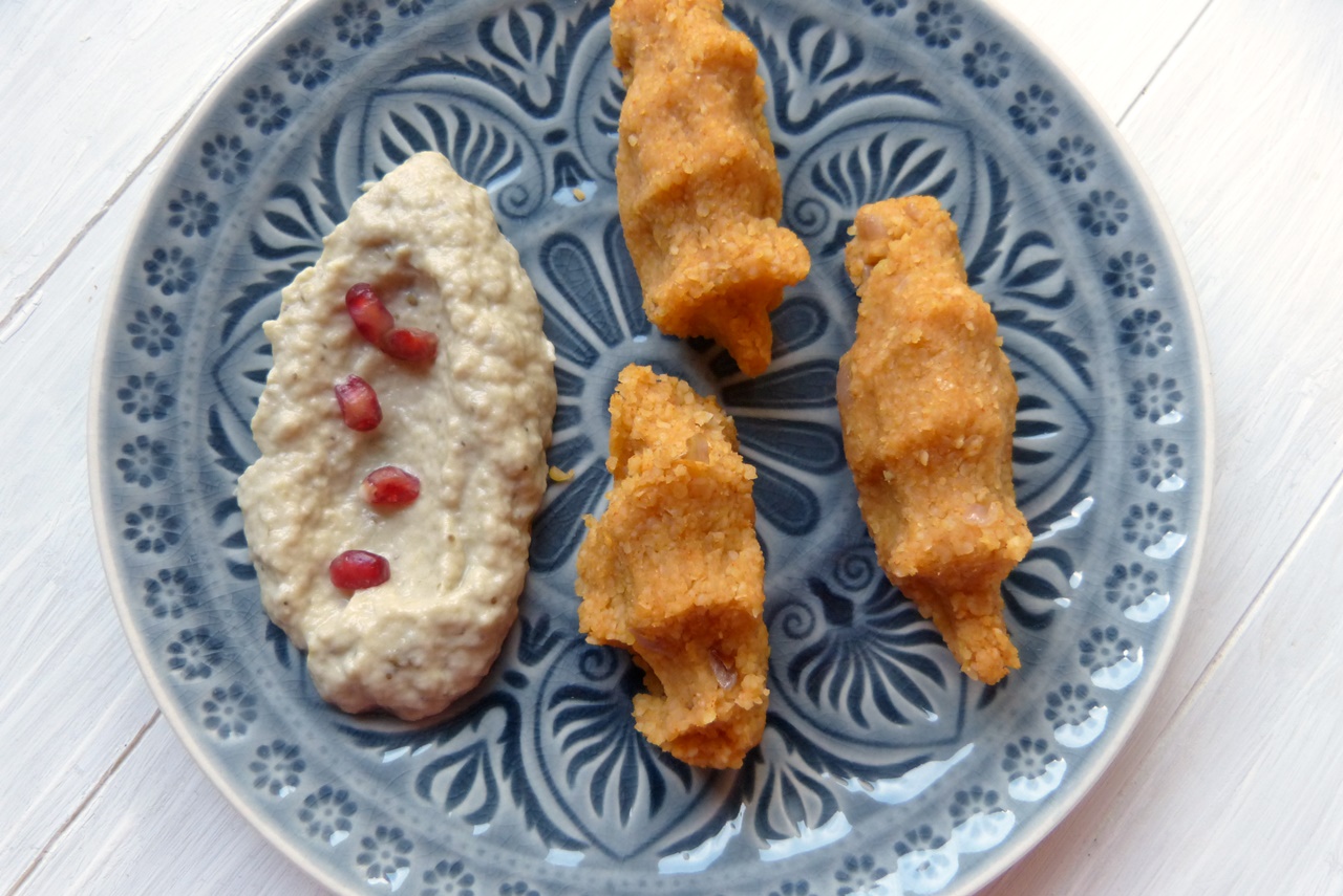 Eigentlich werden die Kibbeh ja mit Granatapfelsirup, Paprikamark oder ein wenig Chilipulver serviert. Ich habe statt dessen Motabbal dazu serviert. Das ist ein Dipp aus im Ofen gegarten Auberginen, Tahin und Joghurt – und eine Sache, von der ich nie genug bekommen kann.