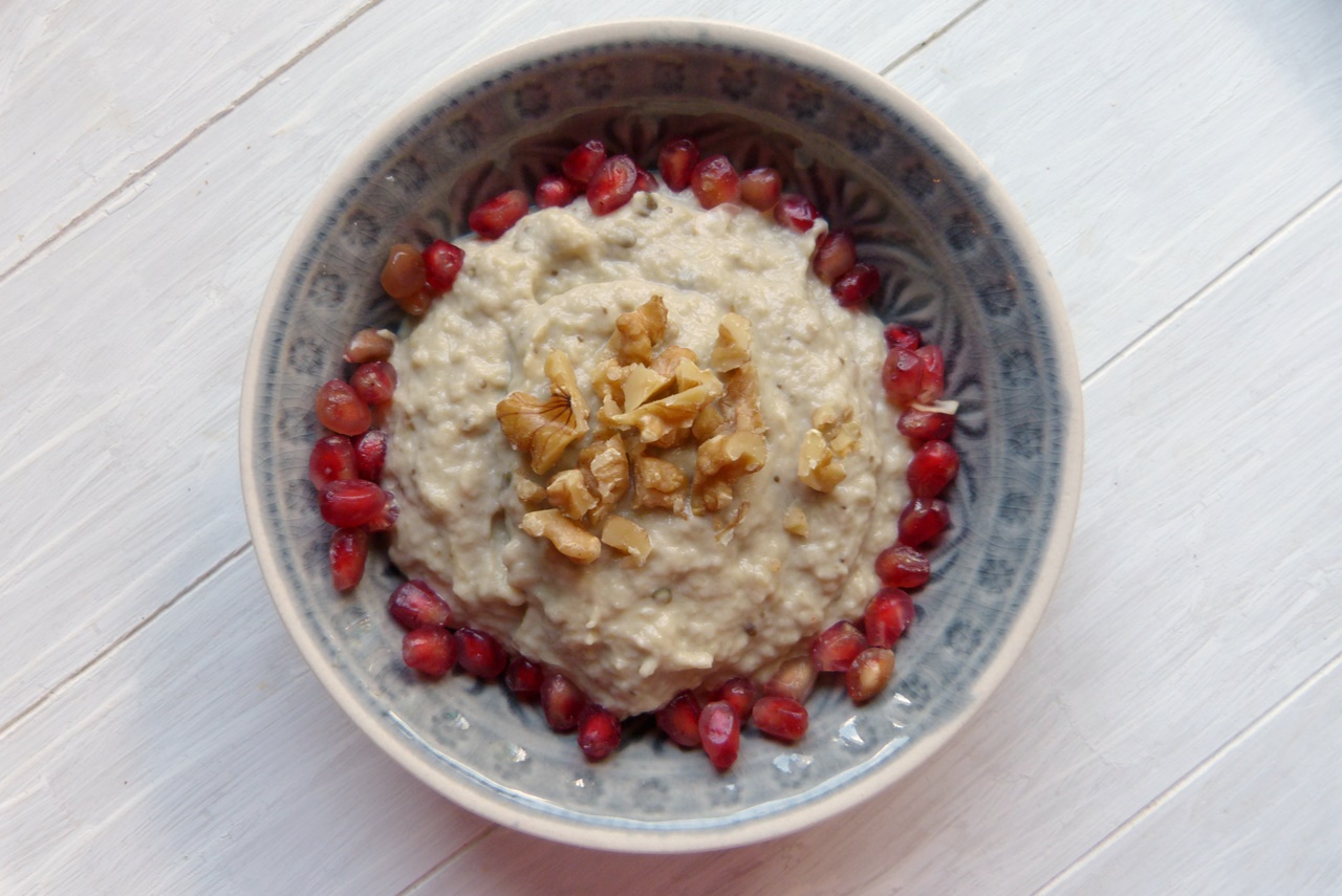 Püree in einer Schale anrichten. Walnusskerne grob hacken. Granatapfelkerne auslösen. Motabbal mit Olivenöl übergießen und mit Granatapfel- und Walnusskernen dekorieren.