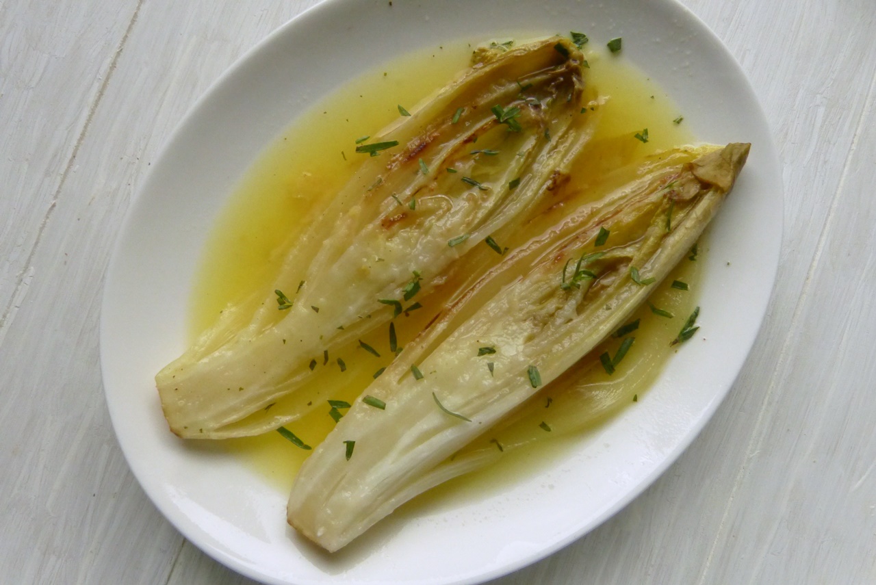 Nein, wir haben das nicht so blank gegessen. Es gab geschmorten Chicorée dazu…Bitterstoffe sollen ja bei der Verdauung helfen. Der Chicorée wird (nach Escoffier) ganz altmodisch mehliert, angebraten, dann in Weißwein und Fond fertig gegart. Das mache ich gerne mal wieder.