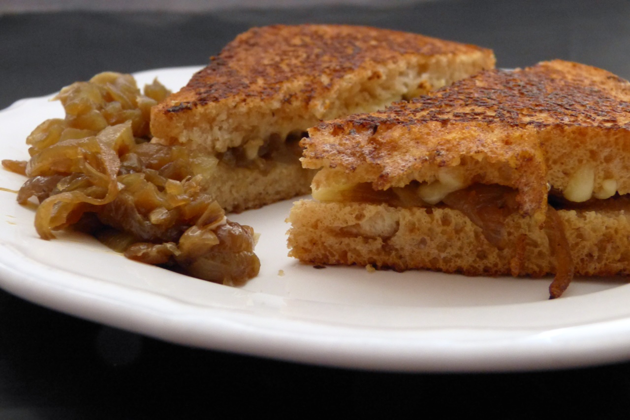 Käsesandwich. Klassischer geht es kaum. Die Füllung besteht aus Cheddar und langsam karamellisierten Zwiebeln. Man sollte japanisches Sandwichbrot verwenden – ich habe das Shokupan von Susanna benutzt. Mit einem anderen Sandwichbrot brauche ich den Meinen sowieso nicht mehr zu kommen. Einen Zusatznutzen bietet das Rezept auch: die Sandwiches werden zum Braten an der Außenseite mit Mayonnaise bestrichen. Das richtig toll – es sorgt für gleichmäßige Bräunung.