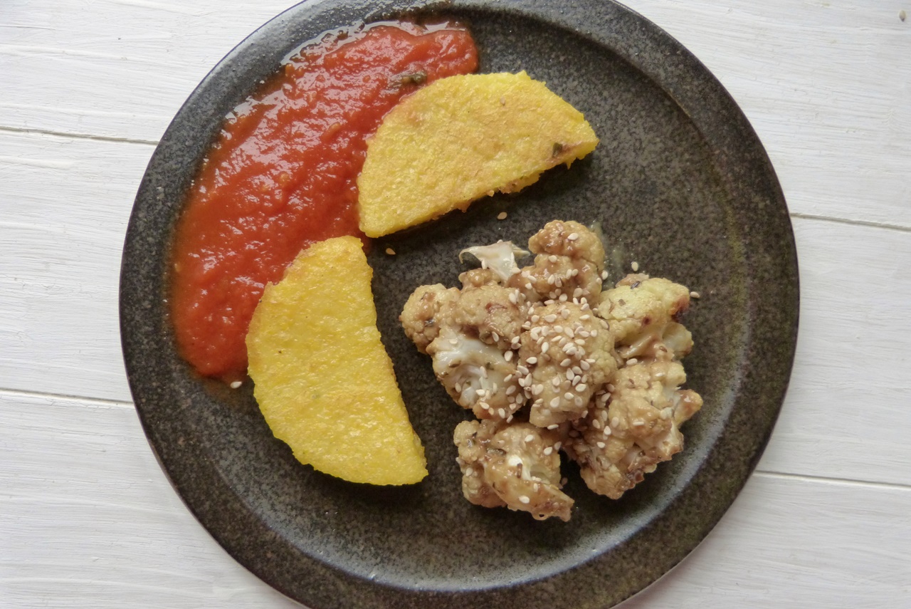 Ich habe mich für den Anfang mit Rezepten aus dem Beilagen- und Grundrezeptekapitel verlustiert. Es gab ofengerösteten Blumenkohl, gebratene Polenta und Tomatensauce. Klingt nicht so aufregend, aber jeder Bestandteil hat einen kleinen Kniff: die Polenta wird nicht einfach gekocht, sondern vor dem Kochen mehrere Stunden in der Brühe eingeweicht – das spart tatsächlich eine Menge Kochzeit und Rühren. Ofengerösteten Blumenkohl gibt es hier oft, das ist ein Standard-Lieblingsessen. Hier kommt allerdings noch ein Dressing aus Tahin, Miso und Rotweinessig dazu. Ich habe mich schwer getan, dem Rest der Familie noch was abzugeben …. Wer das Rezept haben will: etwas abgewandelt gibt es das hier bei Eva. Ok, die Tomatensauce ist wirklich Standard. Sie wird mit einer Mischung aus frischen Tomaten und Dosentomaten gemacht und am Ende kommt etwas Butter dazu.