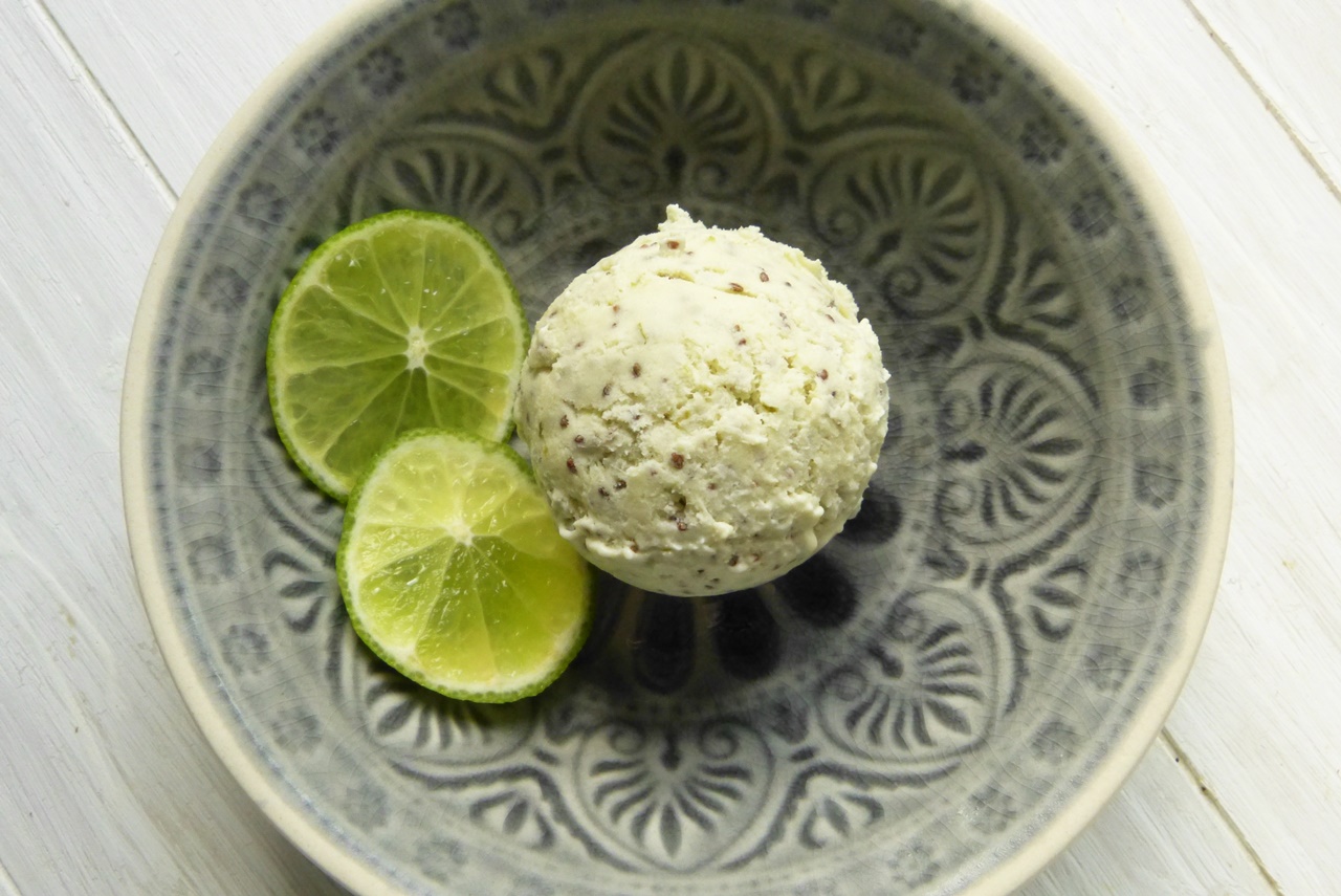 Die Limetten auspressen. Wenn die Eismasse ausgekühlt ist, den Limettensaft und die Chiasamen einrühren. Es ist wichtig, dass die Masse wirklich ausgekühlt ist, sonst gibt es Frischkäse statt Eis.