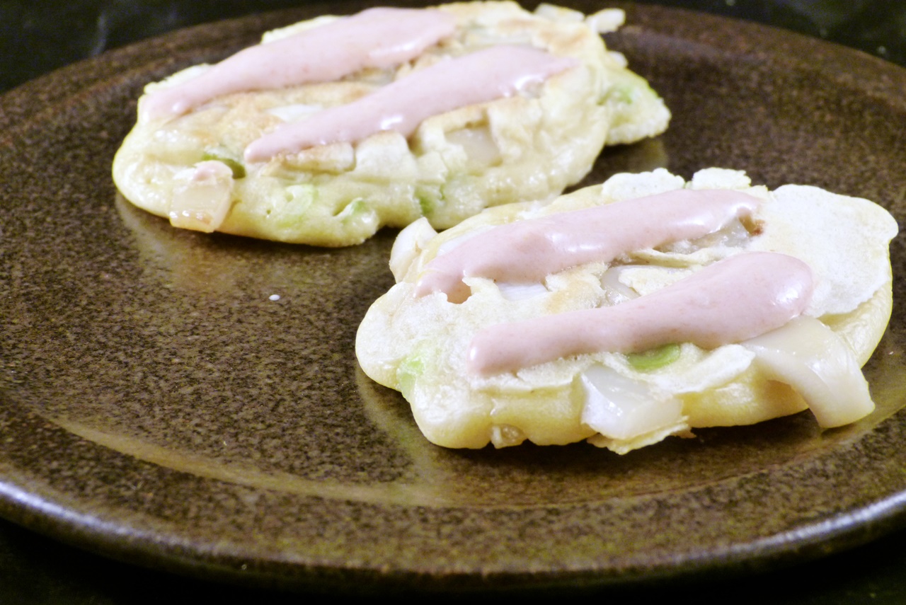 Etwas Öl in einer Pfanne erhitzen; der Boden sollte bedeckt sein. Jeweils ca. einen EL Teig in die Pfanne geben, auf jeden Puffer ein wenig Oktopusfleisch geben und die Puffer bei mittlerer Hitze 2 bis drei Minuten braten, dann wenden und weitere 2 bis 3 min braten. Kurz auf Küchenpapier abtropfen lassen, dann warm stellen. So weiter verfahren, bis aller Teig aufgebraucht ist.