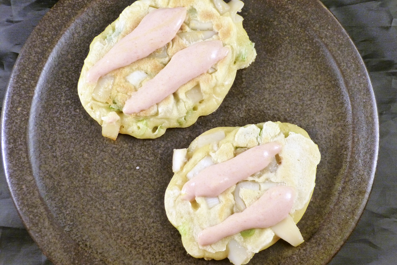 Wenn man es richtig macht, füllt man nun Ketchup und Mayonnaise in getrennte Spritzbeutel mit feiner Tülle und spritzt zum Servieren etwas von beidem dekorativ auf die Puffer. Ich habe statt dessen beides vermischt und die Puffer damit garniert. Wer mag, kann die Puffer zusätzlich noch mit Bonito-Flocken und/oder Seetang bestreuen.