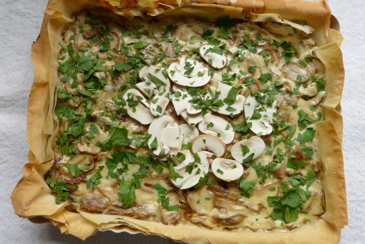 Die Tarte mit Pilzen und Petersilie dekorieren und gleich servieren.