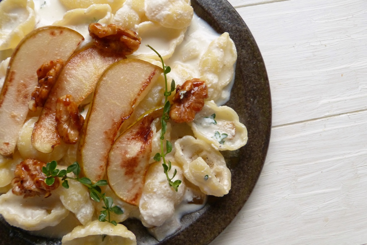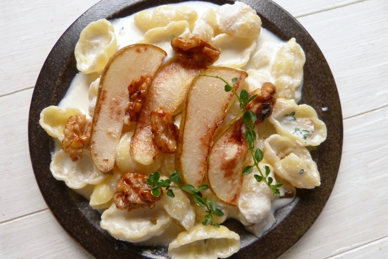 Also, wir sprechen von Pasta, von einer Sauce aus Ricotta und etwas Pastakochwasser, von gebratenen Birnenscheiben und von in Honig karamellisierten Walnüssen. Ihr müsst das probieren, die Mischung aus süß und salzig passt genau und die cremige Sauce in Kombination mit den knackigen Nüssen ist auch klasse. Und habe ich schon erwähnt, dass das Gericht nach einer guten halben Stunde auf dem Tisch steht?