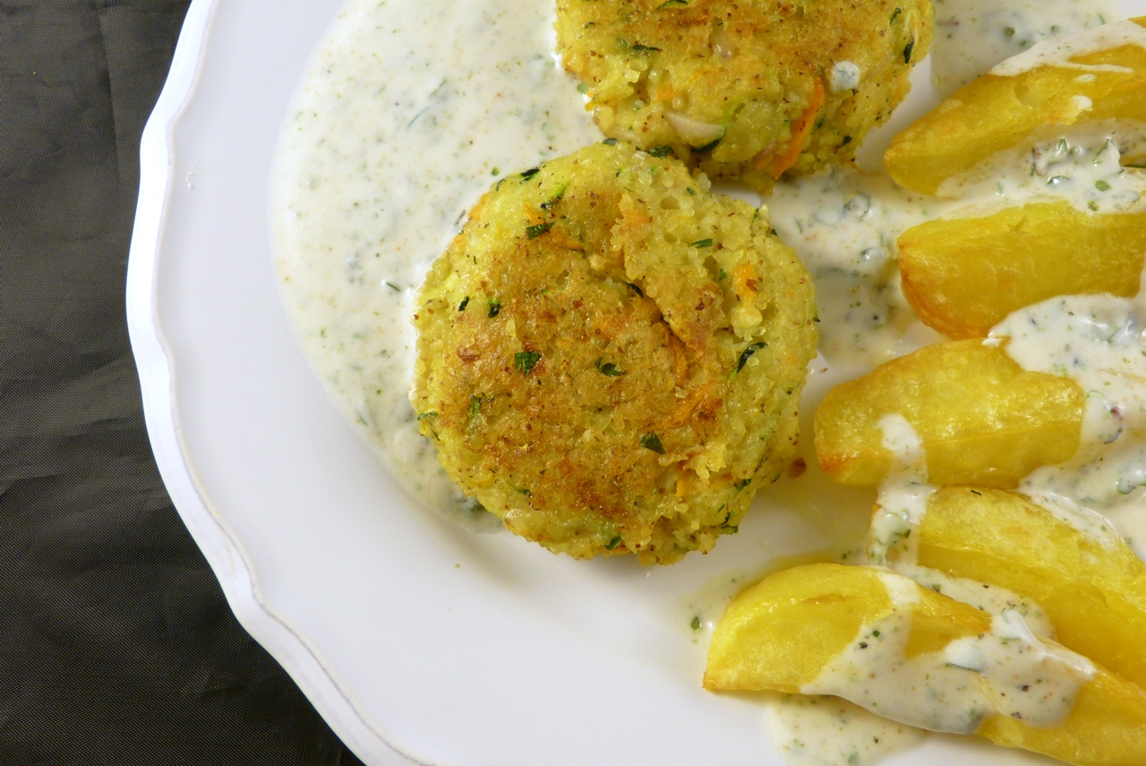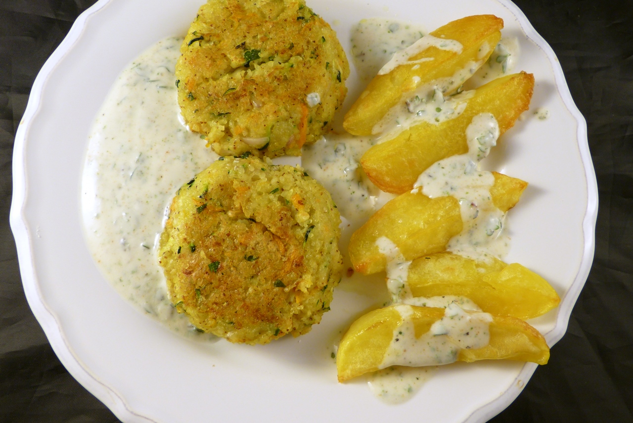 Das Rezept ist variabel. Im Original werden als Gemüse Zucchini, Karotte und rote Paprika verwendet; ich hatte nur Zucchini und Karotte, dafür von beidem etwas mehr. Und man kann auch andere Gemüsesorten in den Pflanzerl unterbringen.