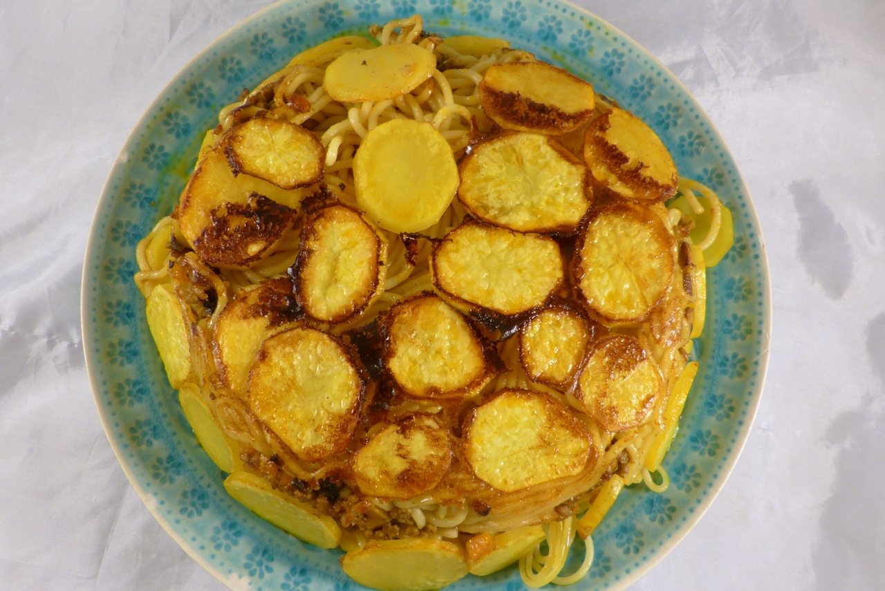 In einem beschichteten Topf 25 g Butterschmalz schmelzen und den Topfboden mit 2/3 der Kartoffelscheiben auslegen. Spaghetti und Sauce schichtweise in den Topf geben. Die restlichen Kartoffelscheiben rund um die Nudeln an der Topfinnenwand platzieren. Den Topfdeckel in ein sauberes Geschirrtuch wickeln und auf den Topf legen. Alles 5 min bei hoher Hitze kochen lassen, dann auf mittlere Hitze stellen. Das restliche Butterschmalz schmelzen, mit 5 EL Wasser mischen und die Mischung über die Spaghetti geben. Alles mit aufgelegtem Deckel weitere 20 min garen. In dieser Zeit entsteht an den Kartoffeln die Kruste.